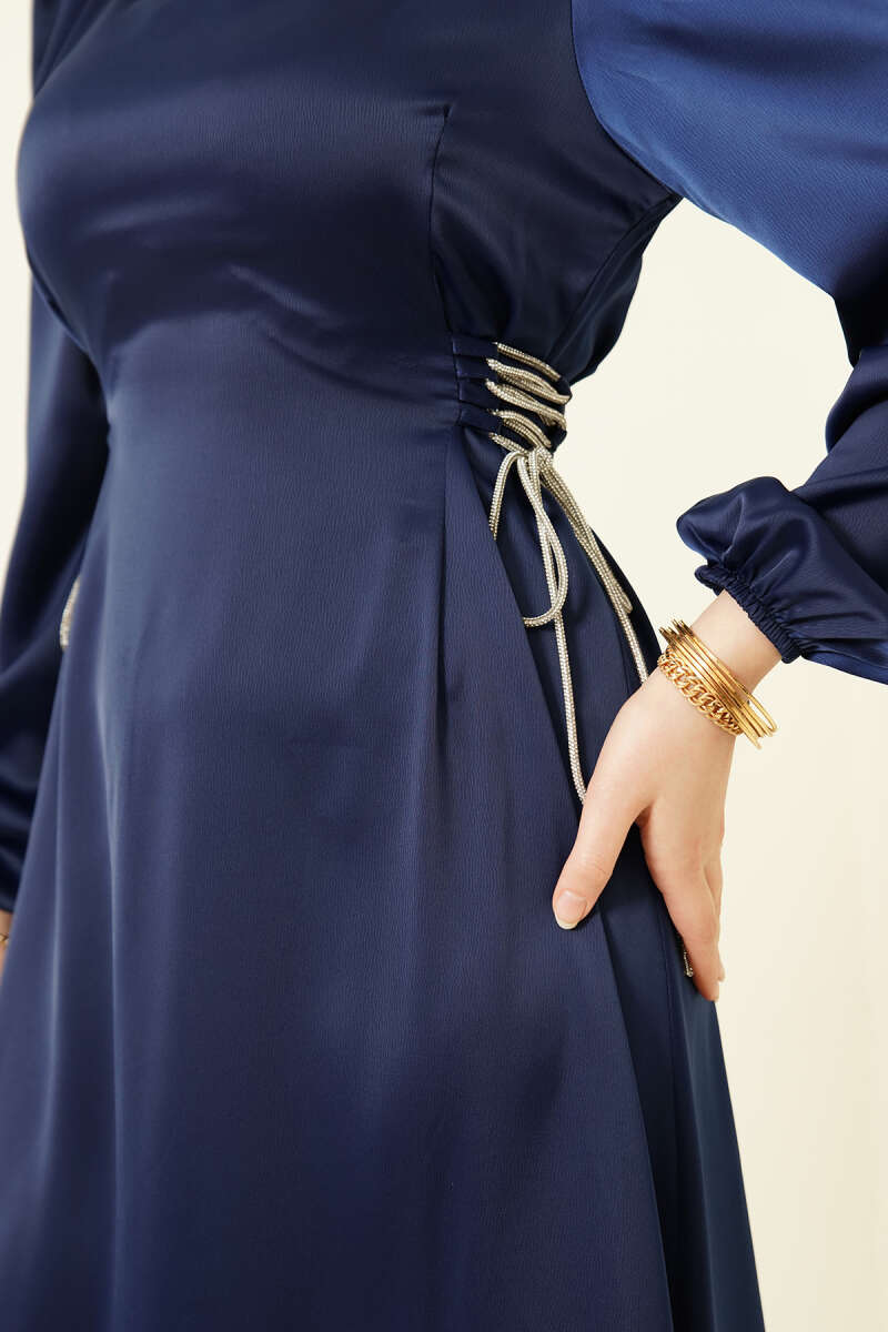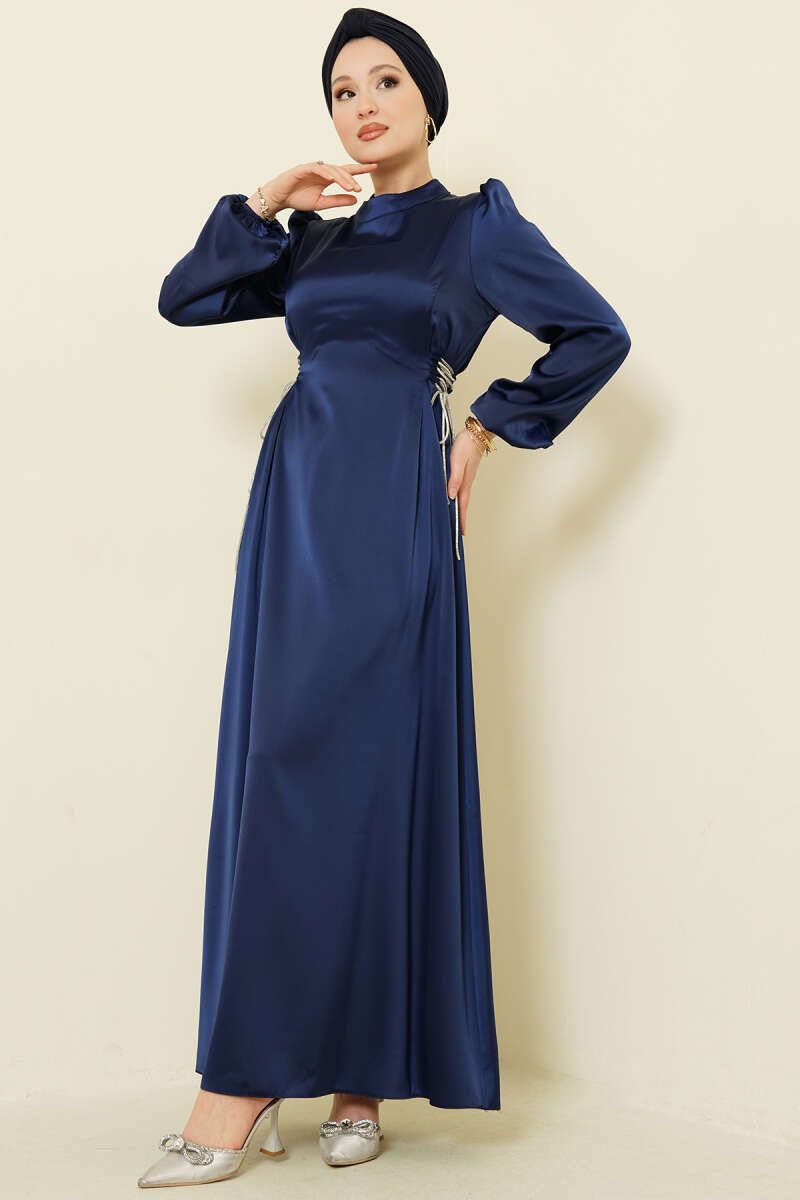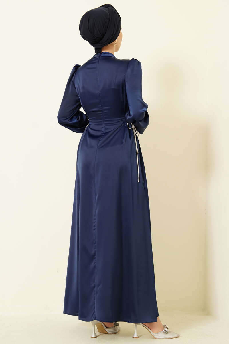 Taşlı Bağlamalı Saten Abiye Elbise Lacivert