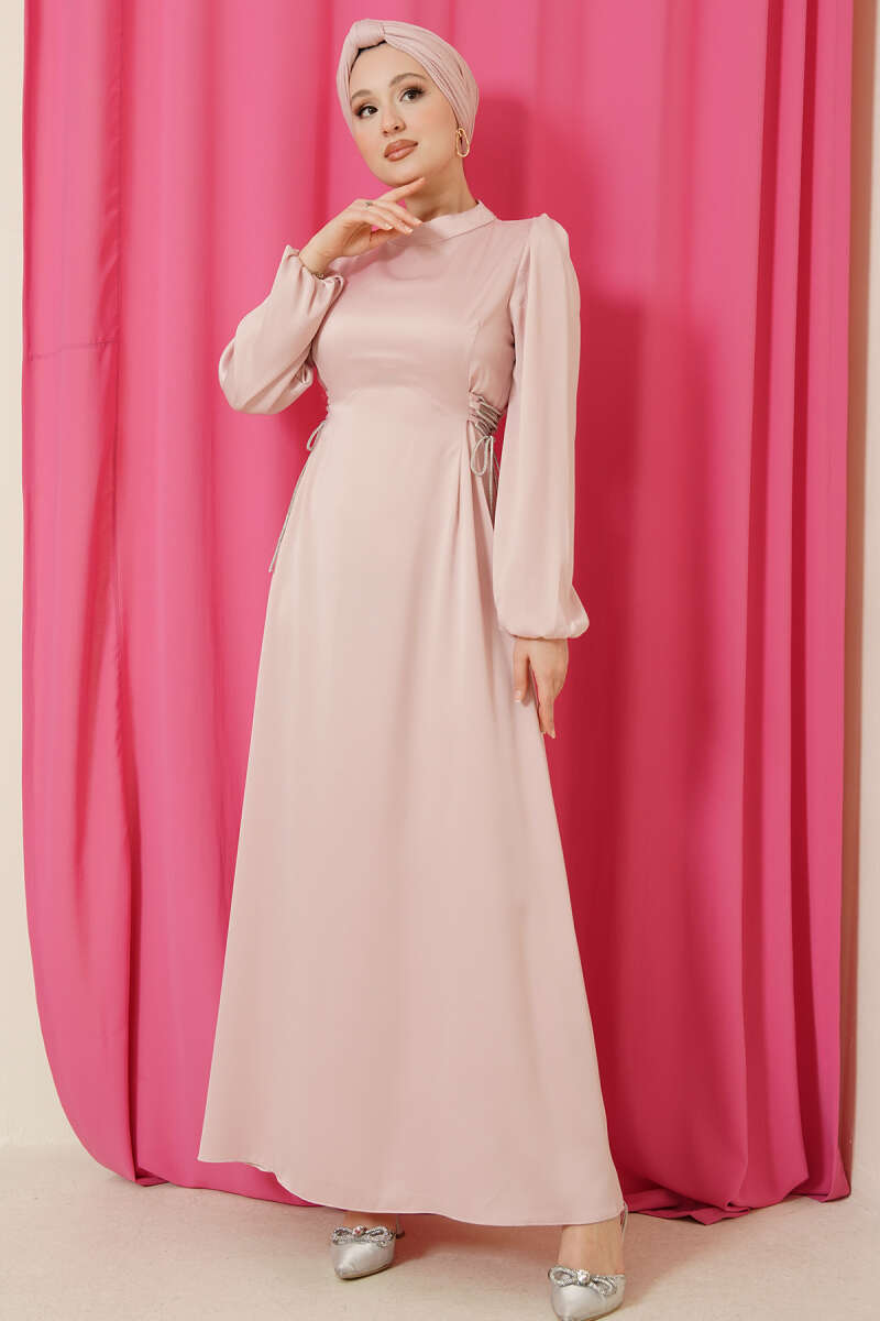 Beli Lastikli Kuşaklı Elbise Bej