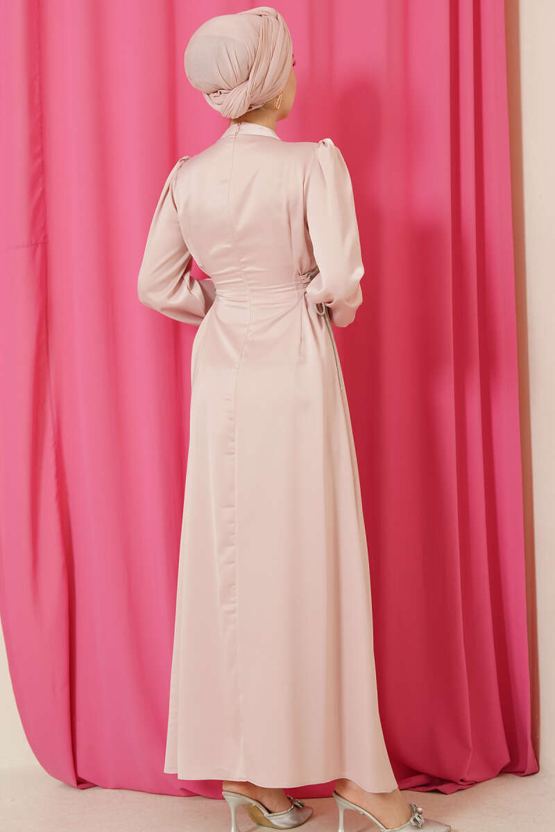 Taşlı Bağlamalı Saten Abiye Elbise Kahve