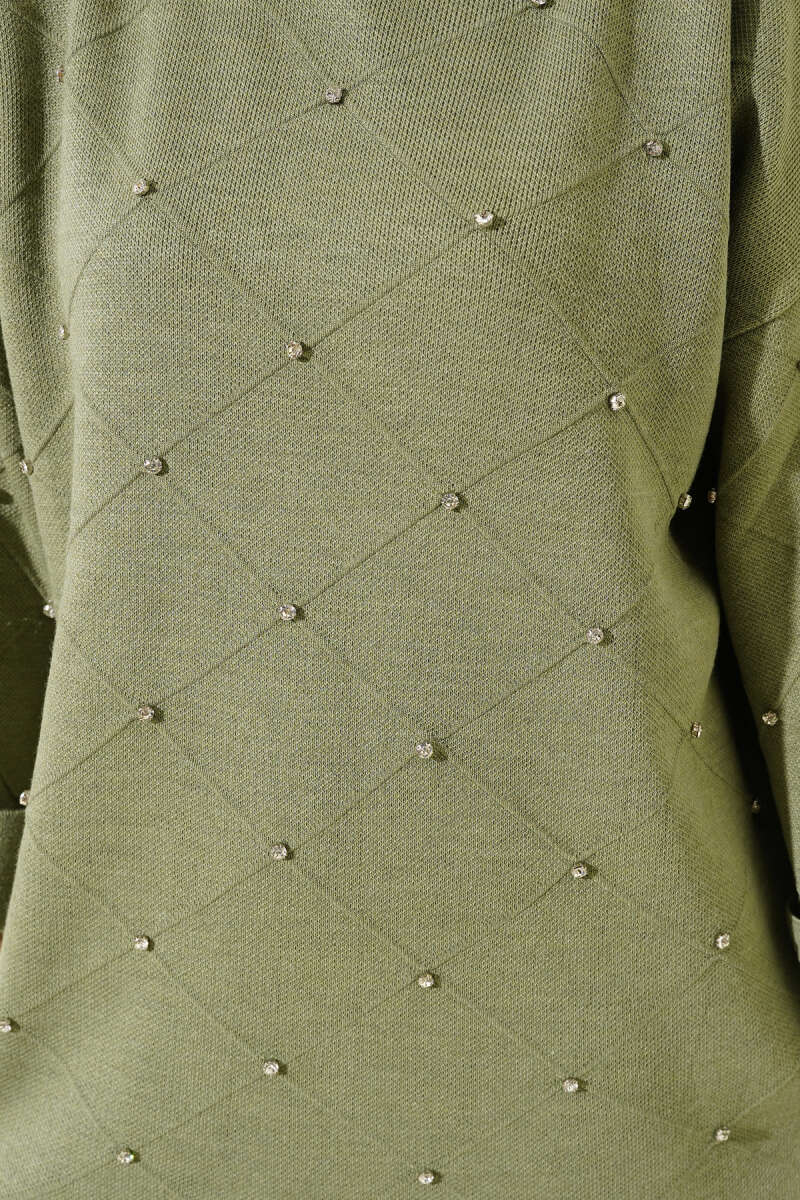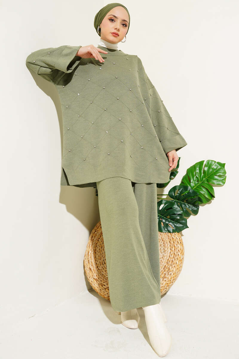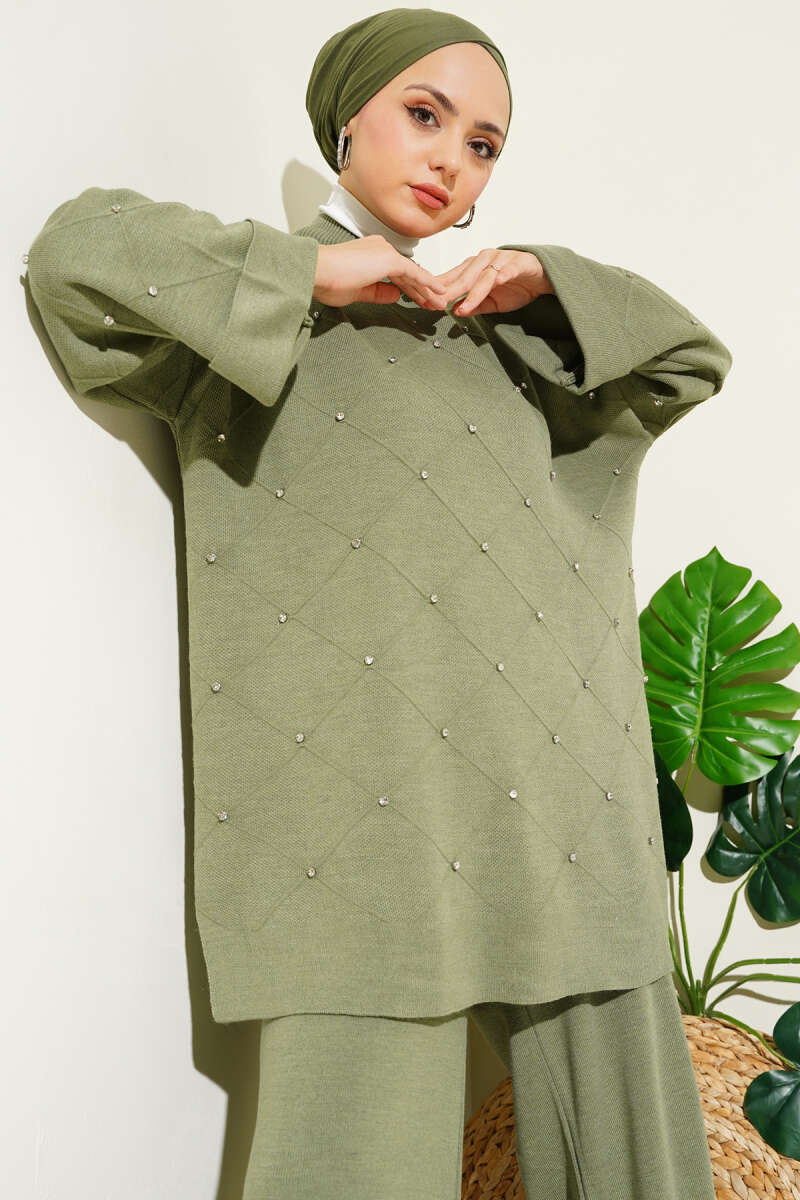 Taşlı Baklava Desen Triko İkili Takım Zümrüt