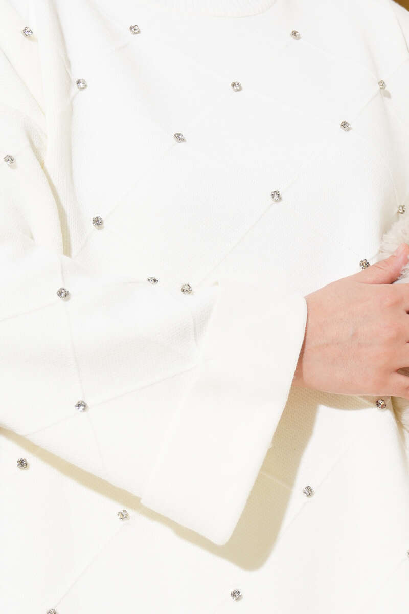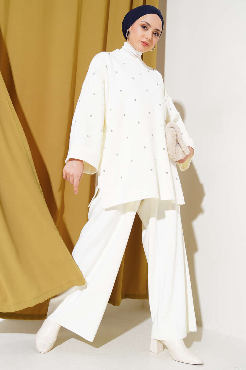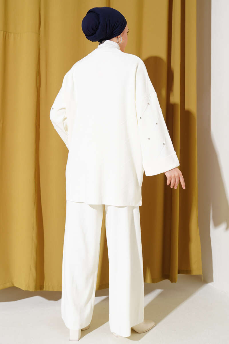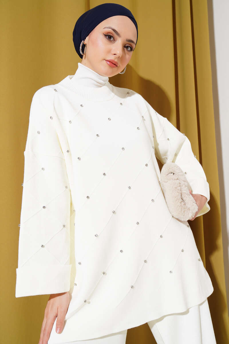 Taşlı Baklava Desen Triko İkili Takım Bej