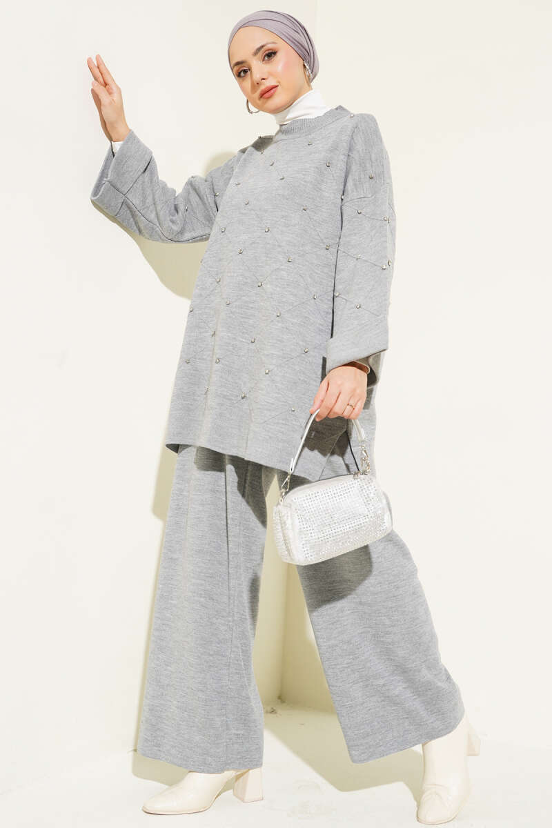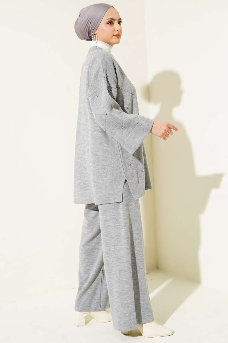 Balon Kol Balıkçı Yaka Triko İkili Takım Gri