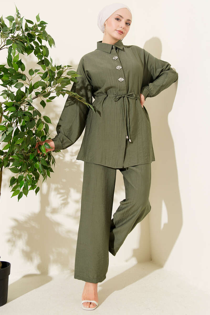 Taşlı Bel Tünelli Tunik İkili Takım Vizon