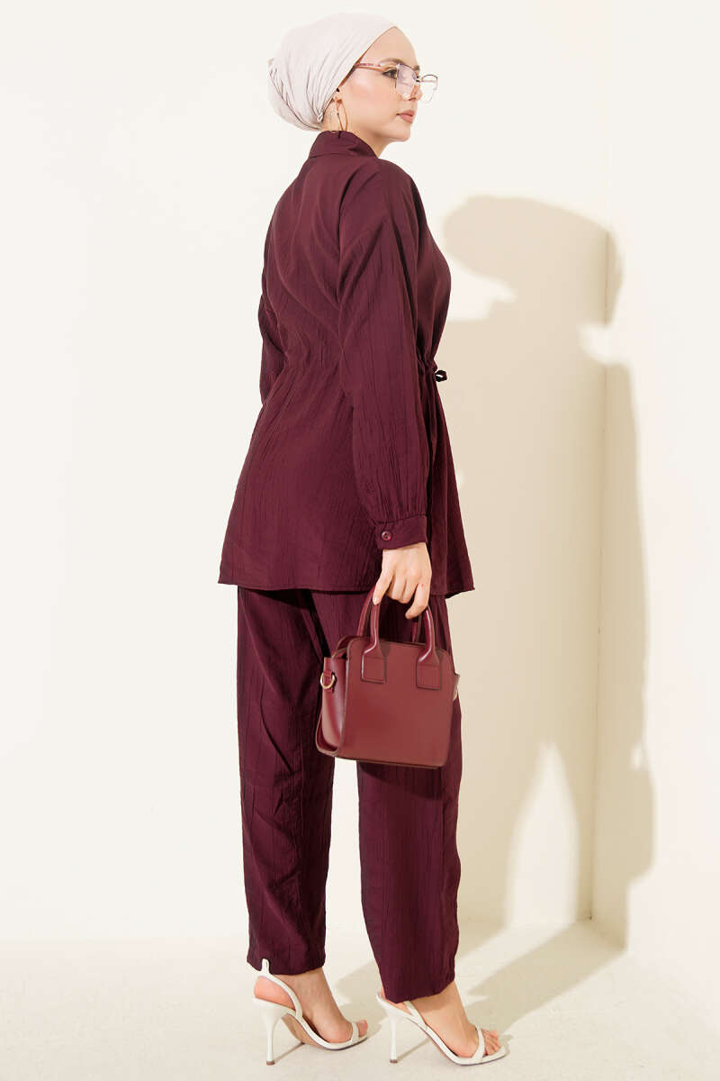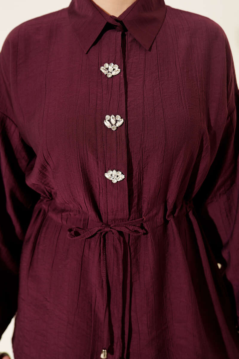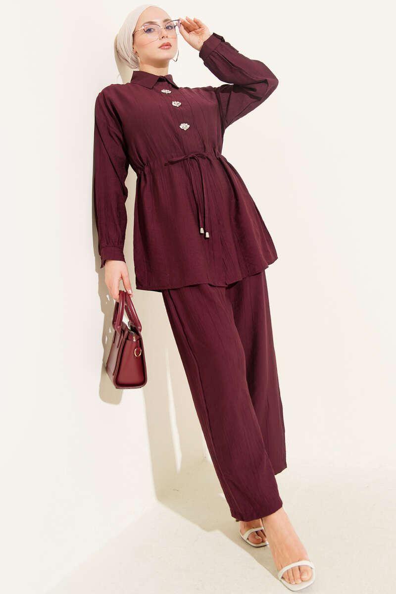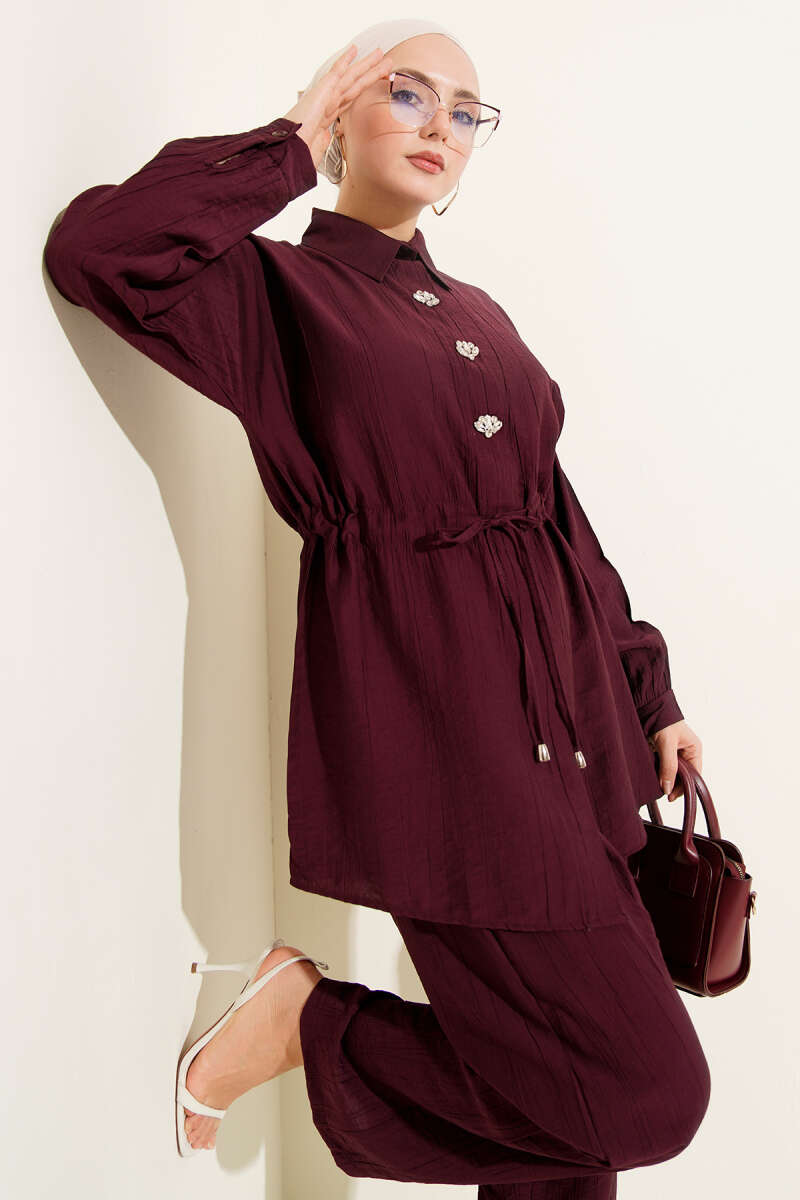 Taşlı Bel Tünelli Tunik İkili Takım Mürdüm