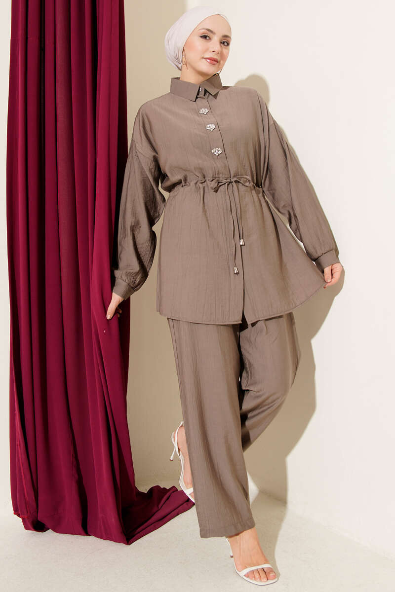 Taşlı Bel Tünelli Tunik İkili Takım Kahve