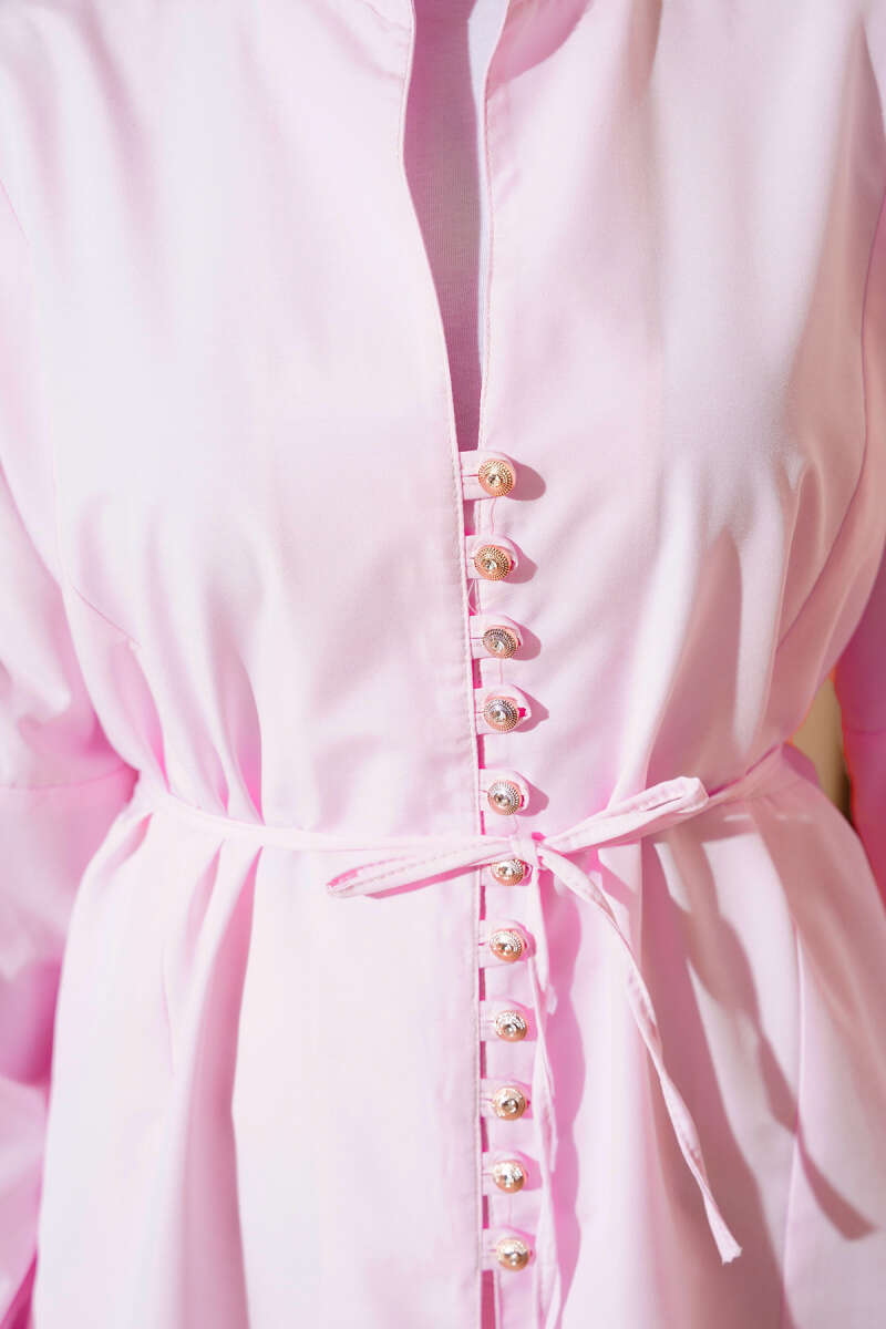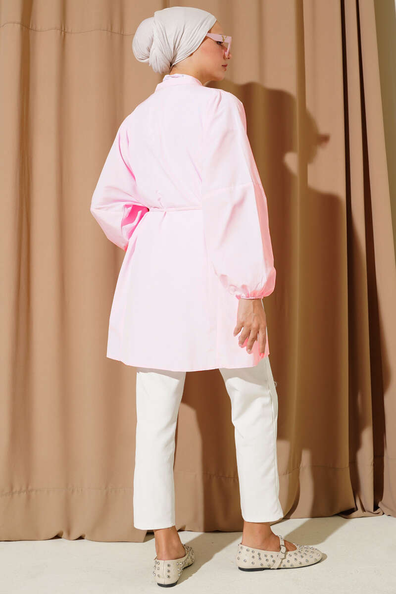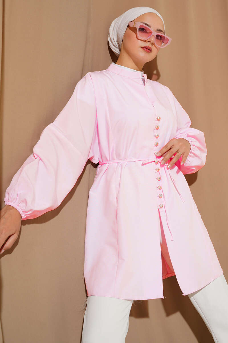 Gizli Düğmeli Bel Kuşaklı Gömlek Pembe