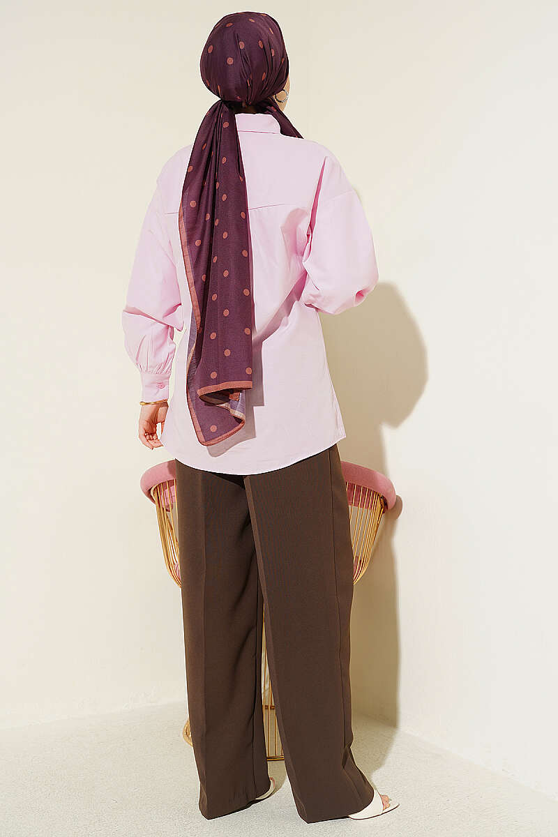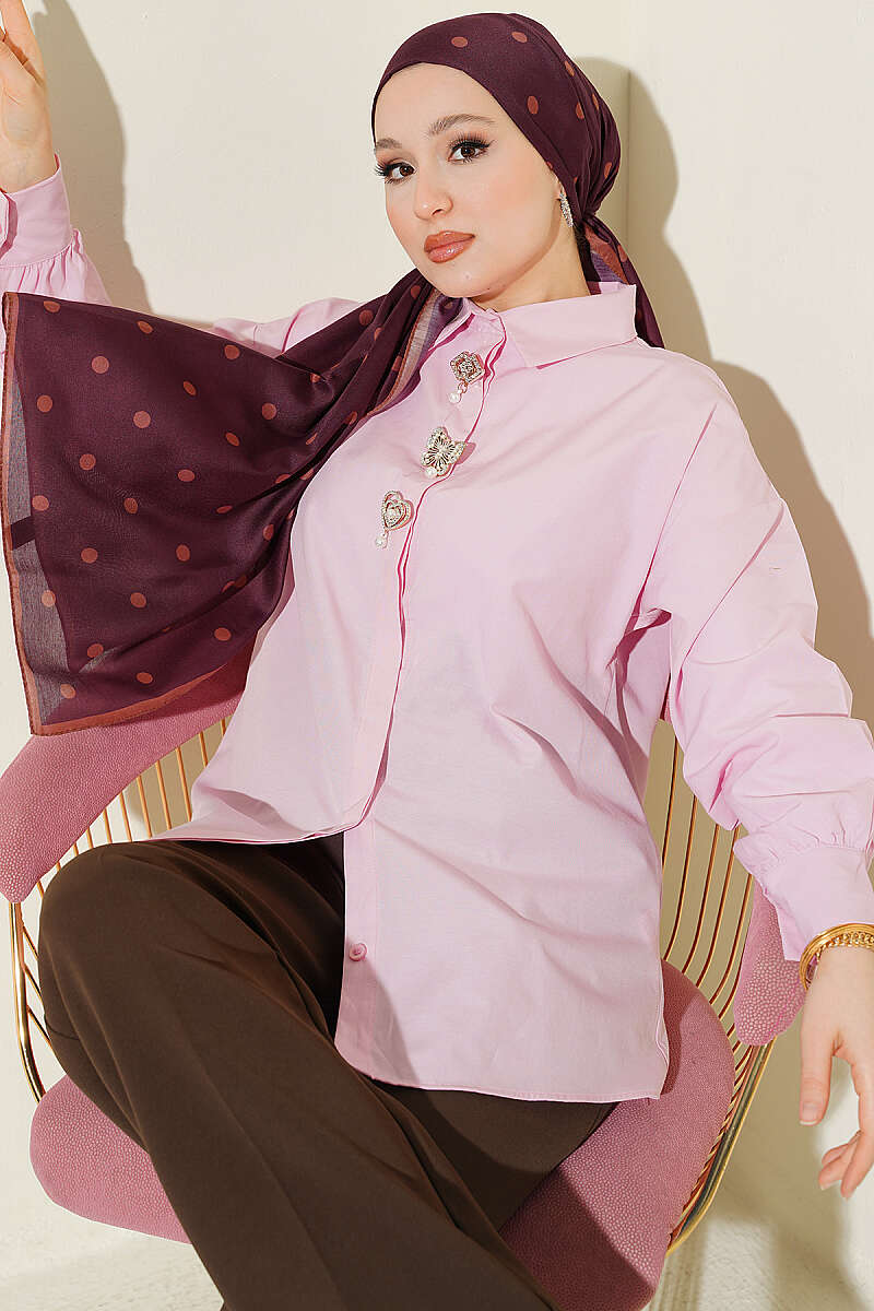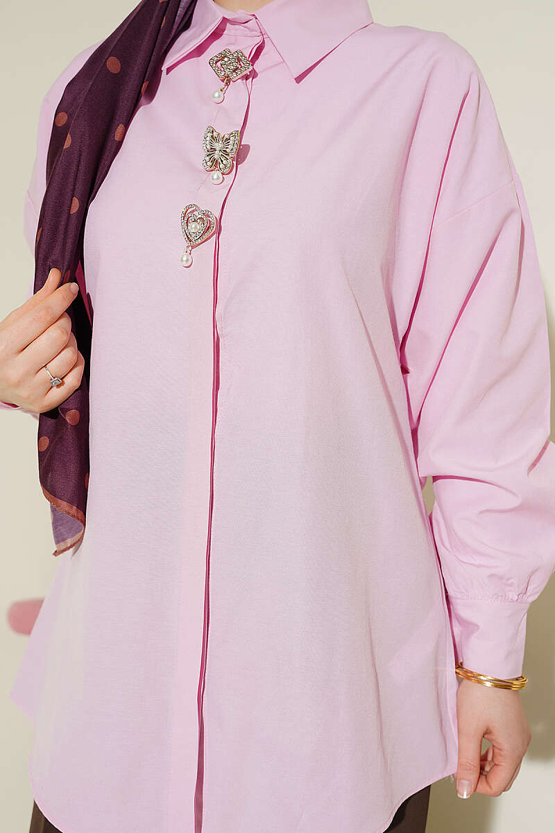 Taşlı Broşlu Gizli Düğmeli Gömlek Pembe