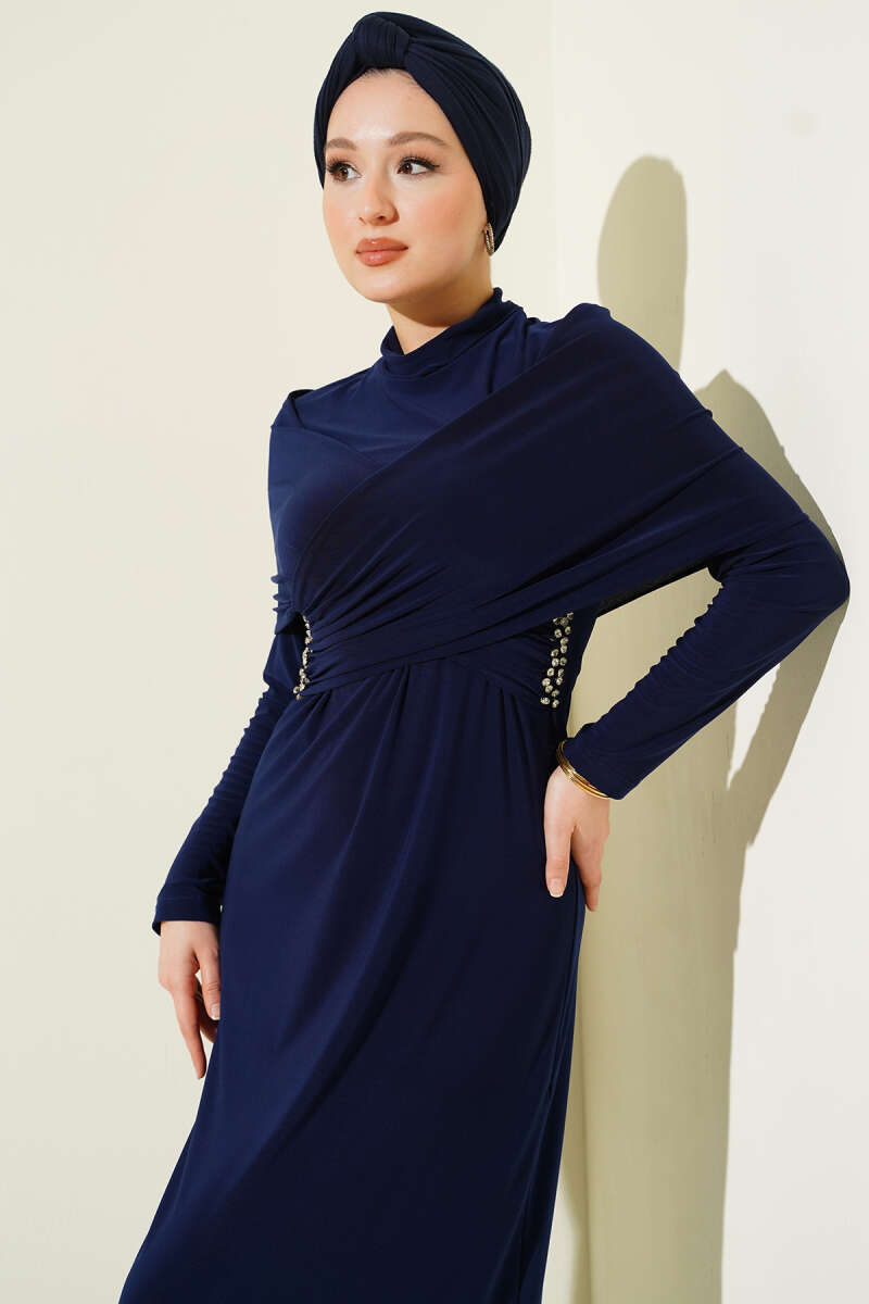 Taşlı Çapraz Yakalı Sandy Abiye Elbise Lacivert