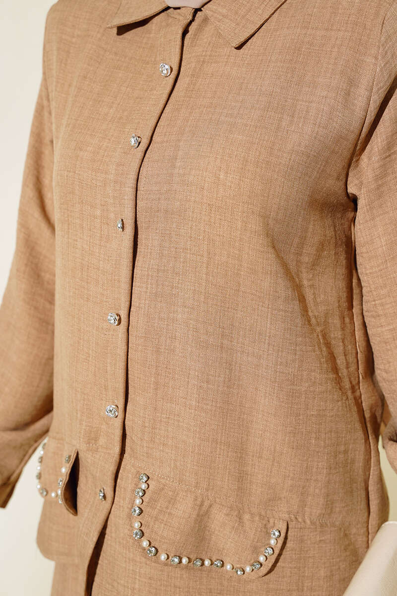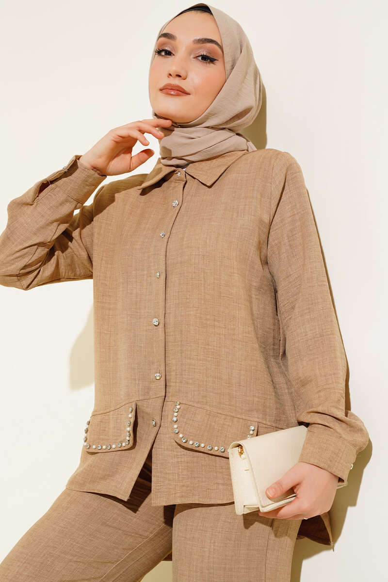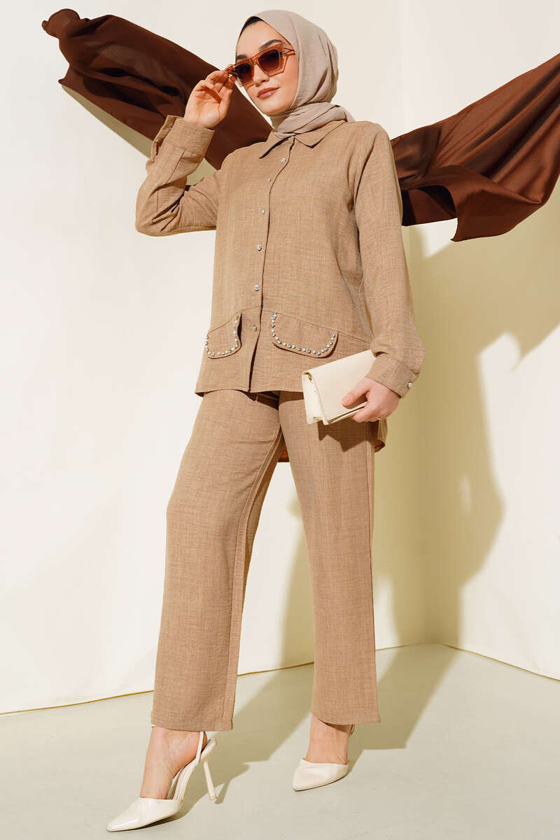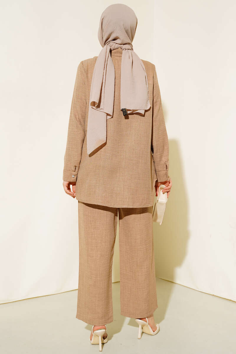Yeni sezon ikili takımımız tunik ve pantolondan oluşmaktadır. Tuniğimiz boydan düğmeli olup, önü kısa arkası uzun modeldir. Tuniğimizin iki adet taş süslemeli, cep detayı bulunmaktadır. Tuniğimizin kol bilekleri manşetli ve düğmelidir. Pantolonumuzun beli lastiklidir. İki adet cep detayı mevcuttur. Bol paçadır. İkili takımımız şık ve zarif görünümüyle favoriniz olacaktır. Renk seçenekleri mevcuttur.