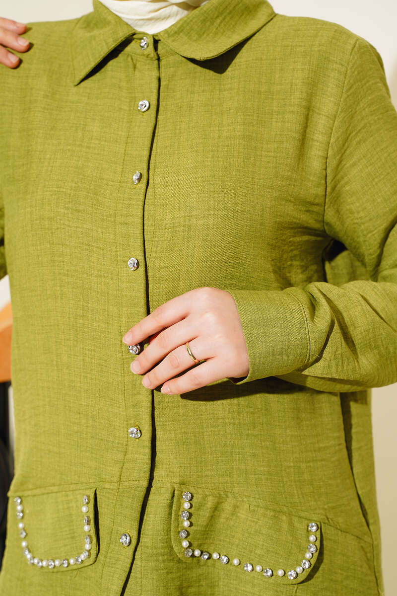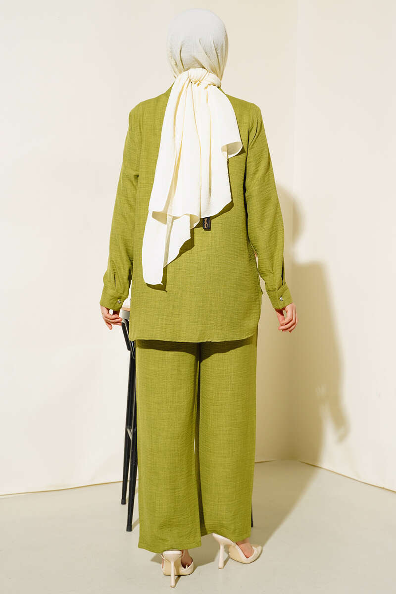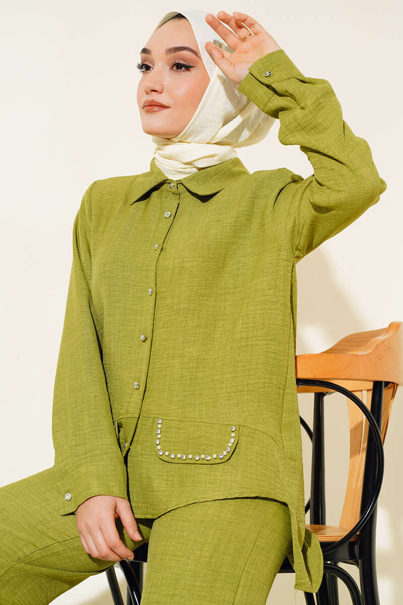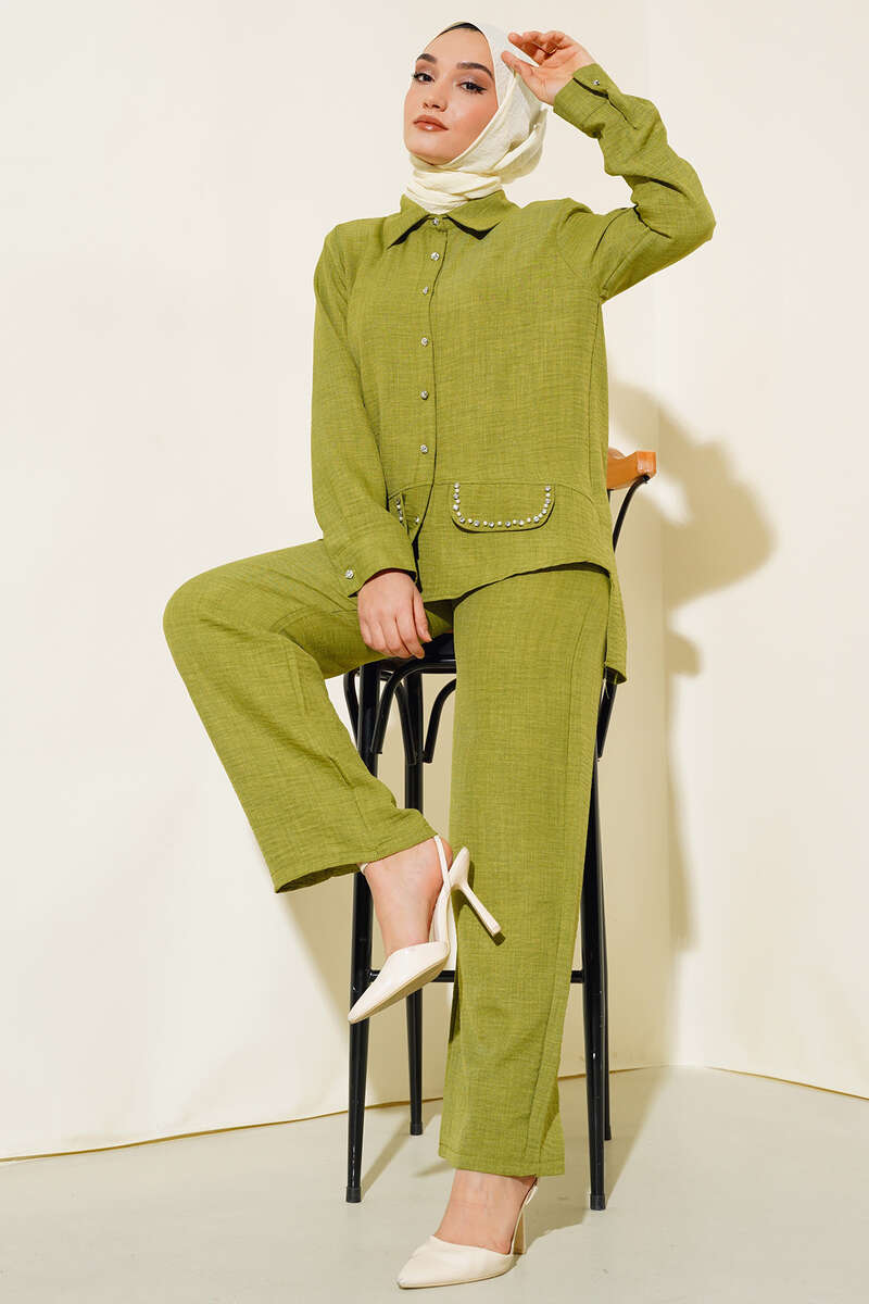 Taşlı Cep Detaylı İkili Takım Yağ Yeşili