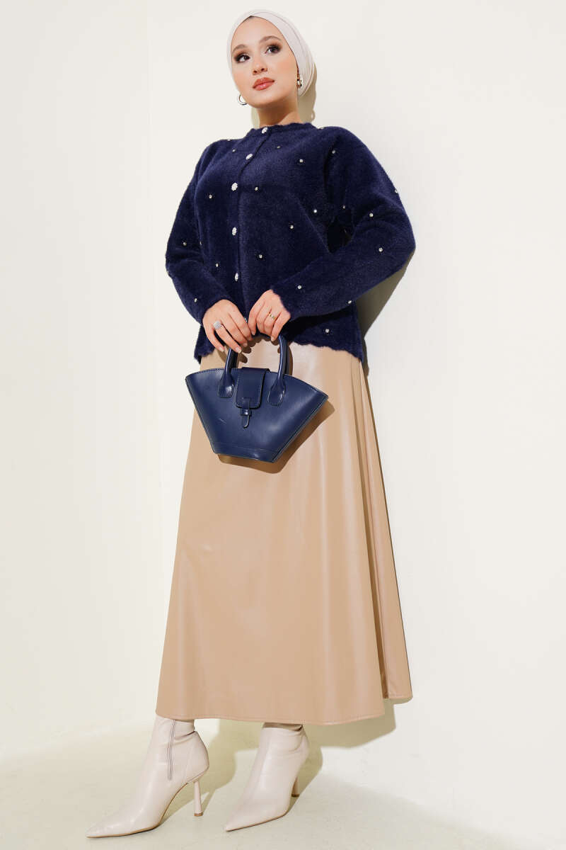 Çiçekli Baklava Desenli Triko Hırka Bej