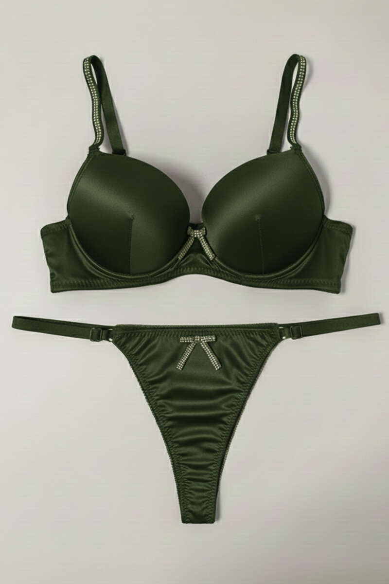 Taşlı Deri Garnili Sütyen Takımı Haki