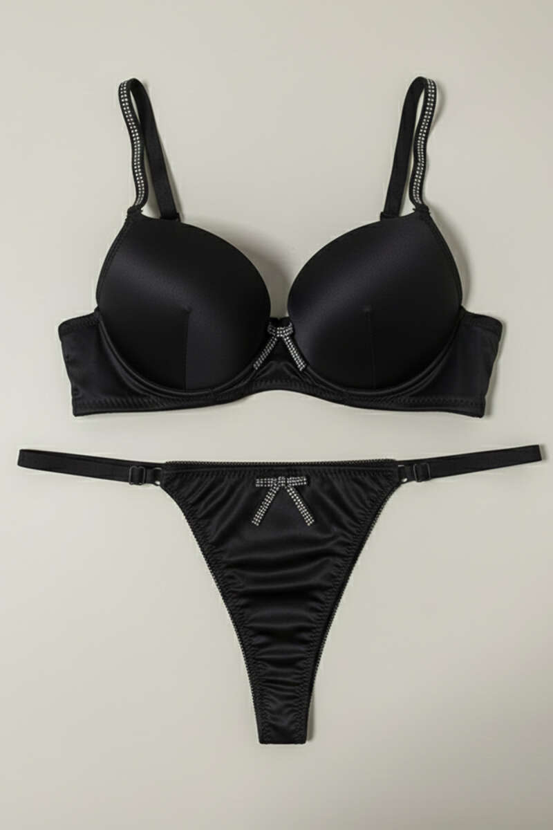 Taşlı Deri Garnili Sütyen Takımı Siyah