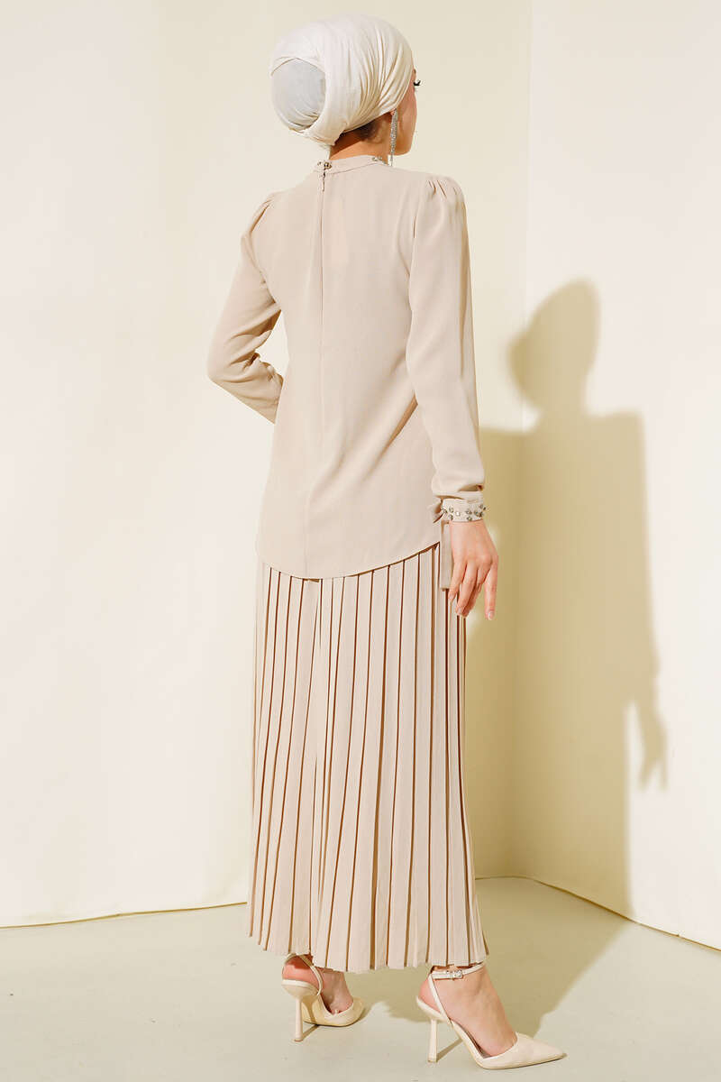 Taşlı Detaylı Etekli İkili Takım Bej
