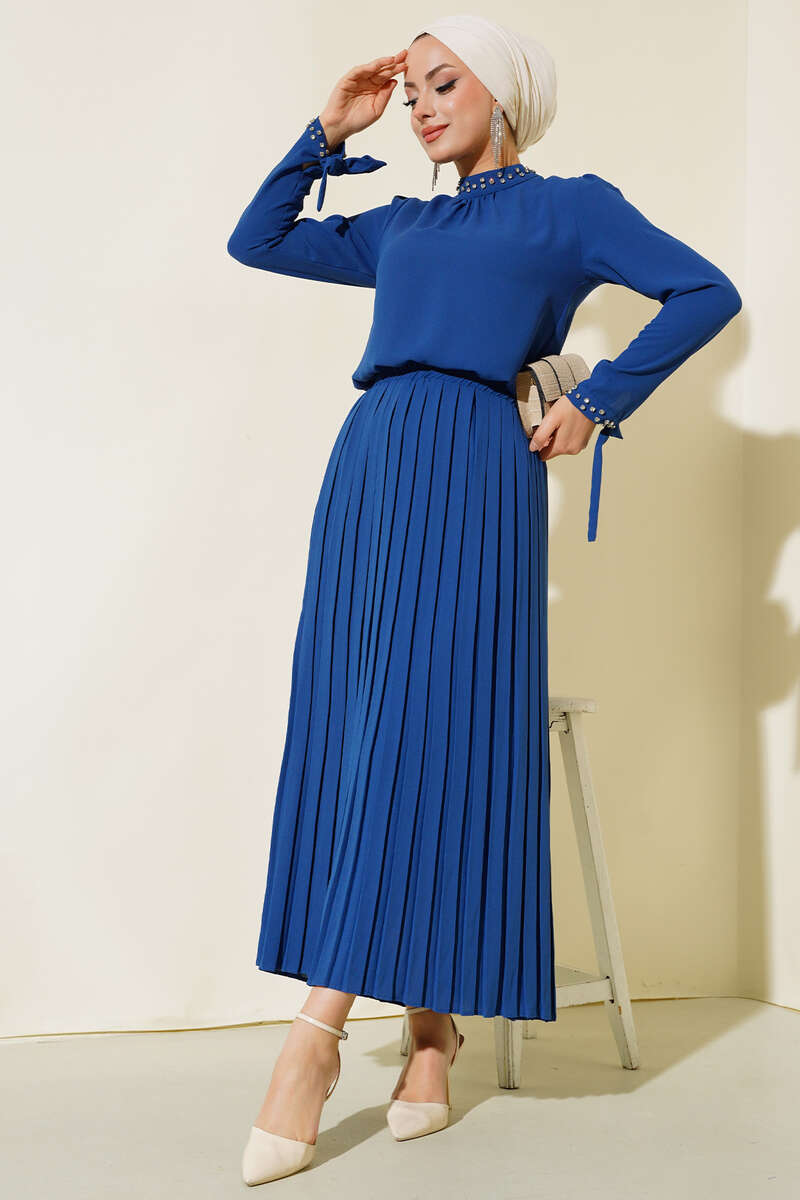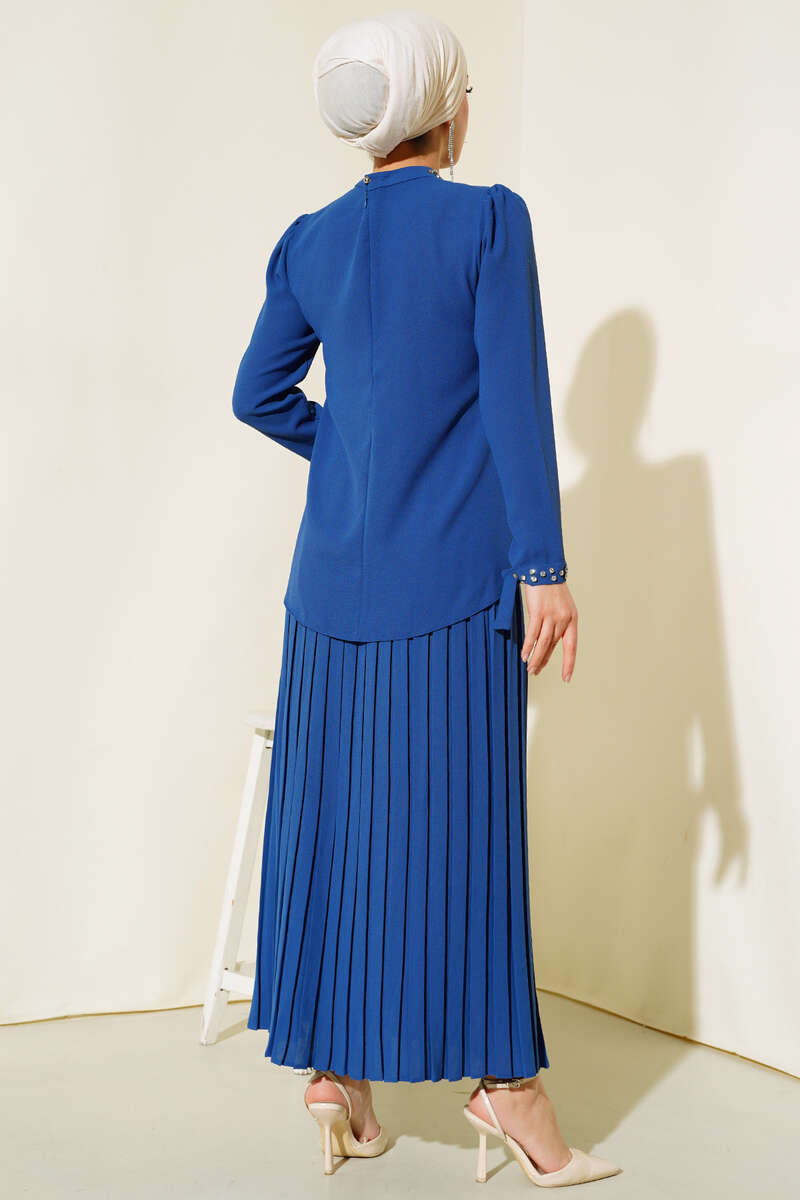 Sezonun favorileri arasında yerini alan etekli ikili takım modelimiz sizlerle beraber. Tuniğimizin boyun ve kol bilekleri taşlarla süslenmiştir. Tuniğimizin sırt kısmı fermuarlıdır. Kol bilekleri bağlamalıdır. Eteğimizin beli lastiklidir. Pileli modeldir. Renk seçenekleriyle dolaplarınızda yerini beklemektedir.