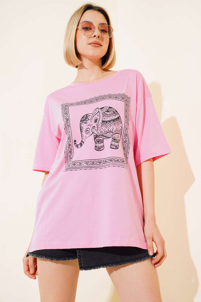 Taşlı Fil Baskılı T-shirt Pembe