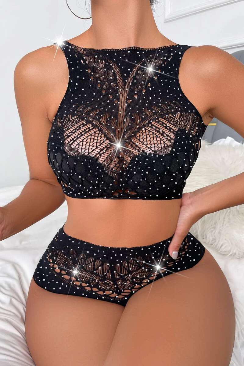 Taşlı Geçişli File Fantezi Vücut Çorabı Siyah