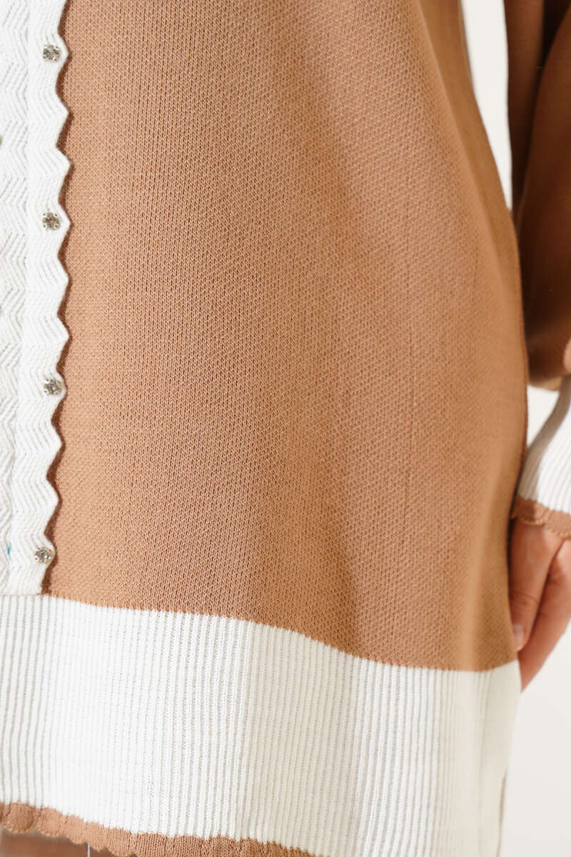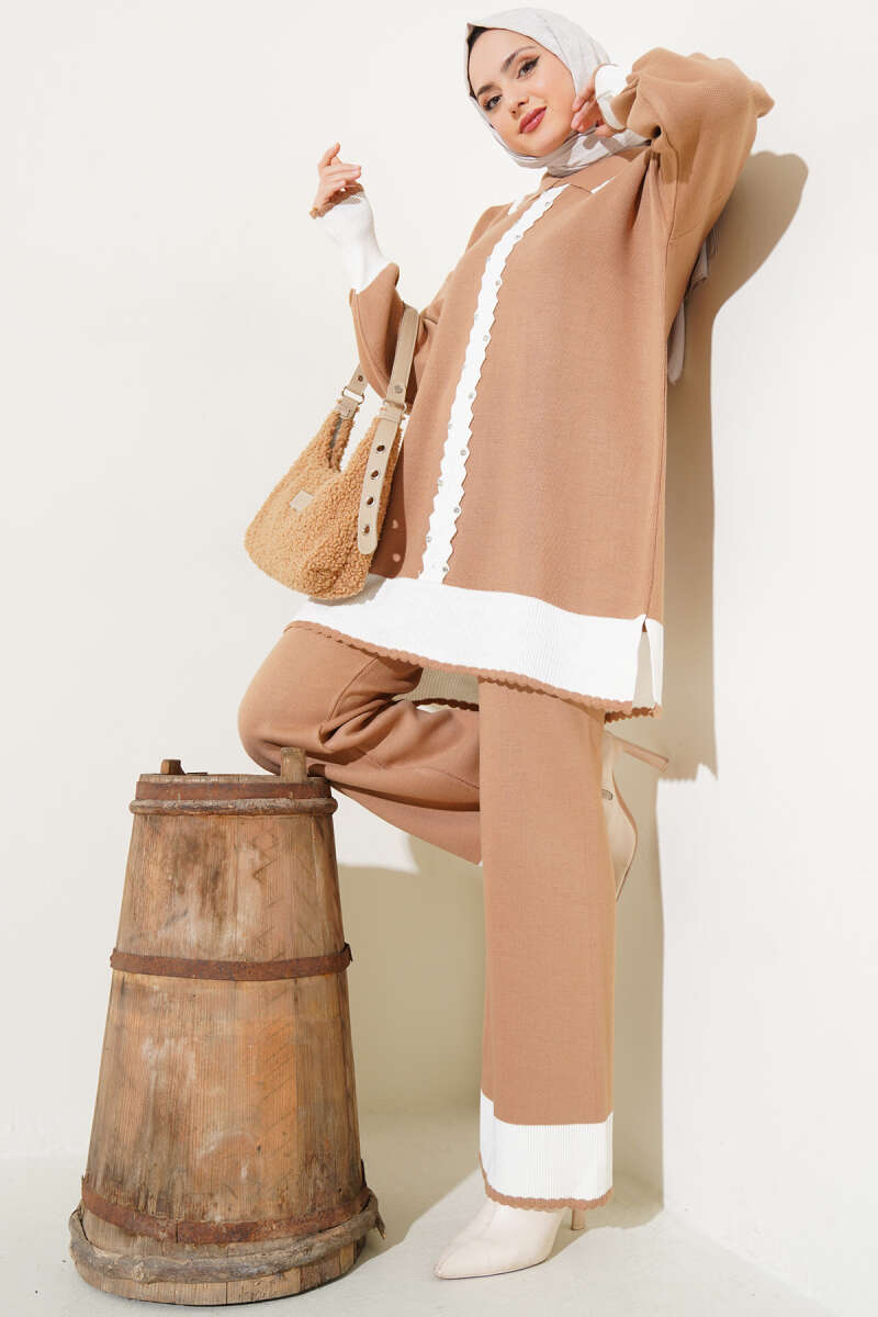 Kruvaze Yaka Düğmeli Triko İkili Takım Bej