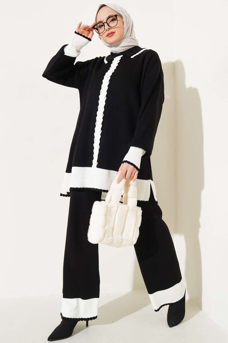 Baklava Desen Düğmeli Triko Hırka İkili Takım Siyah