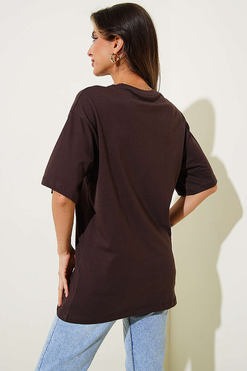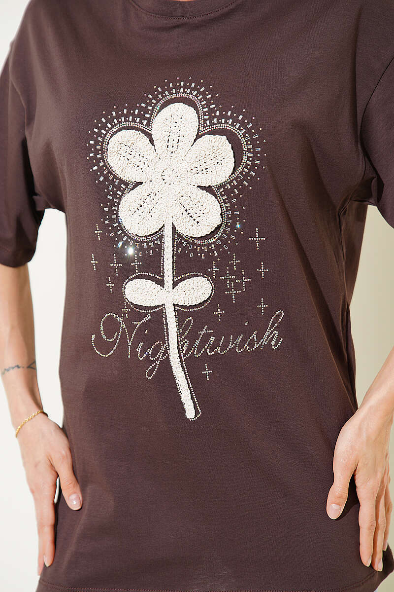 Taşlı Güpür Çiçekli T-shirt Kahve