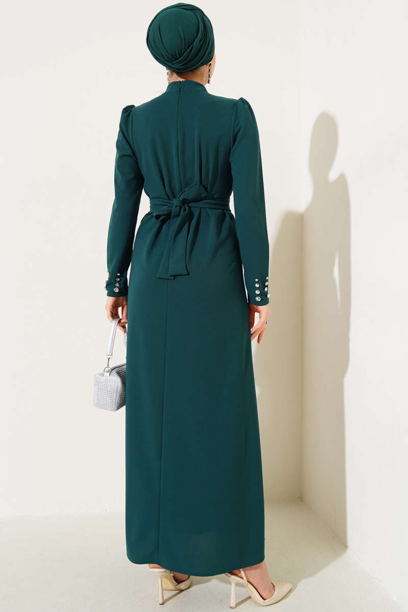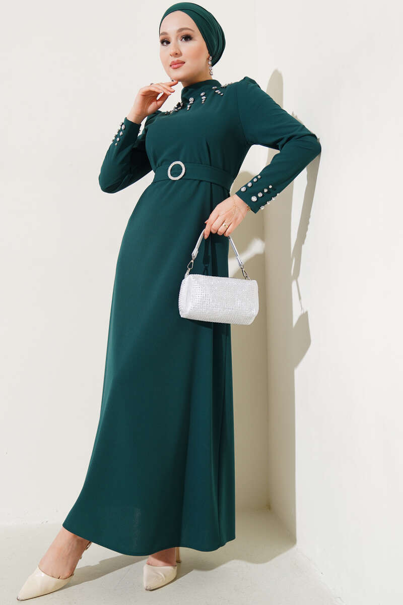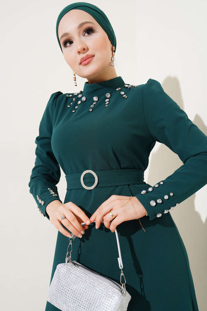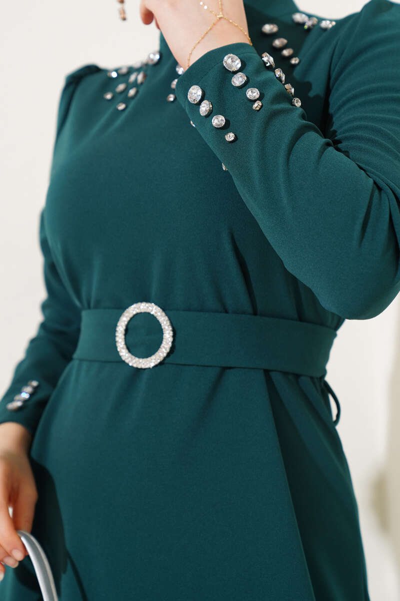 Taşlı Kemer Tokalı Elbise Zümrüt