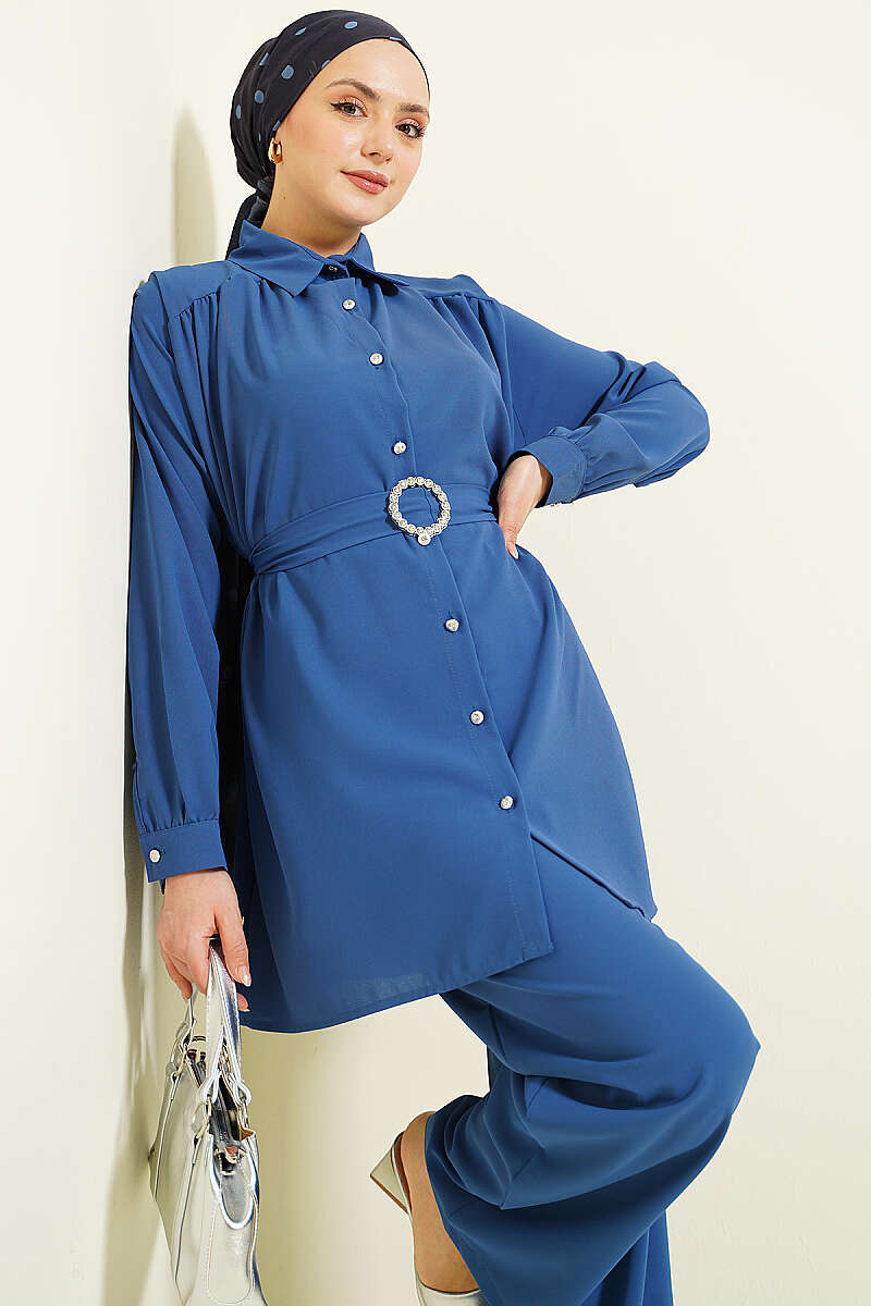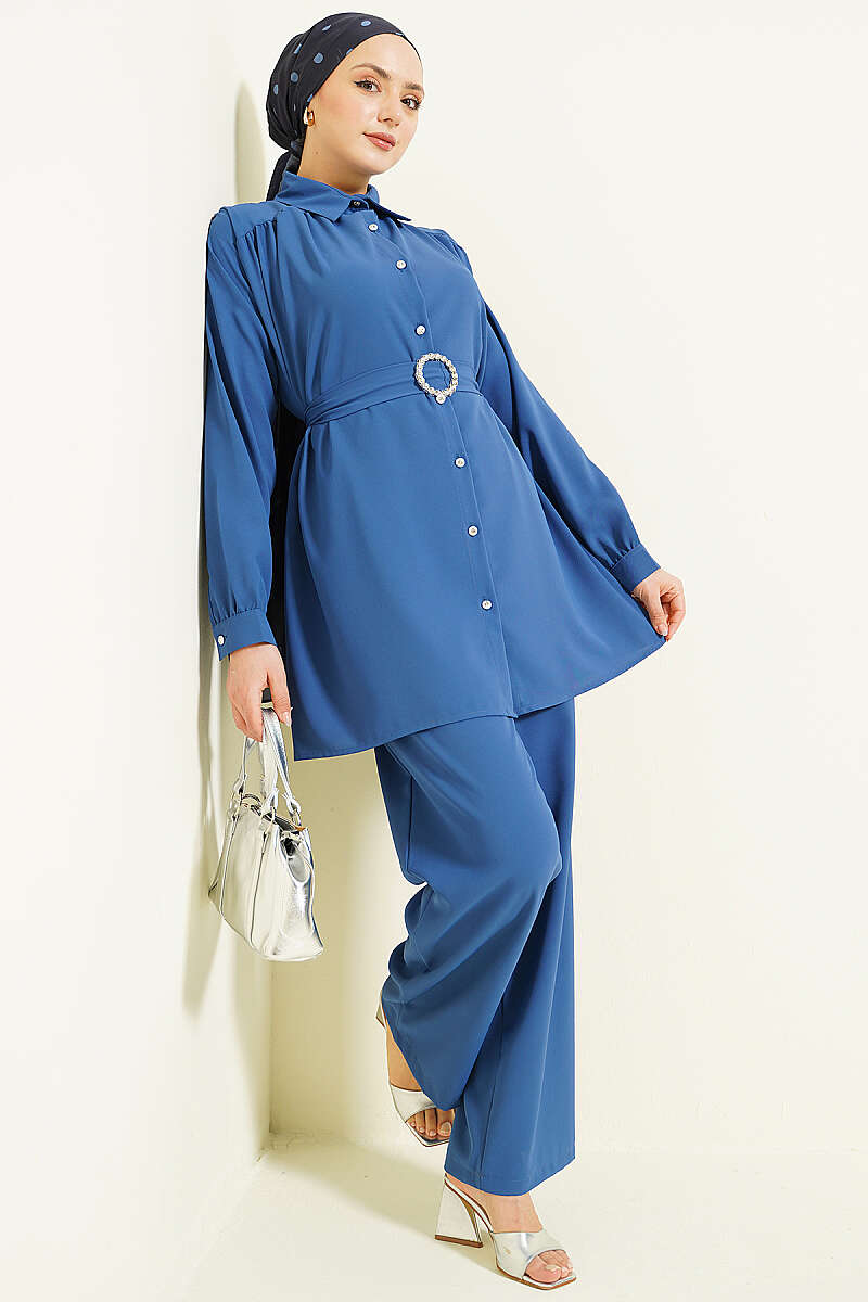 Taşlı Kemer Tokalı Kuşaklı İkili Takım İndigo