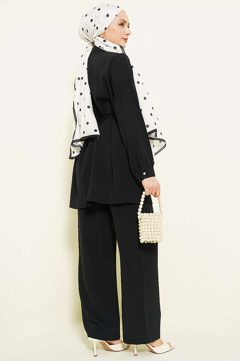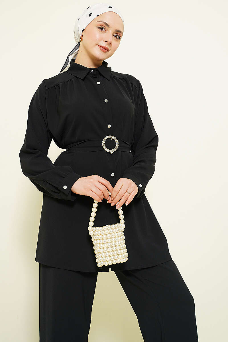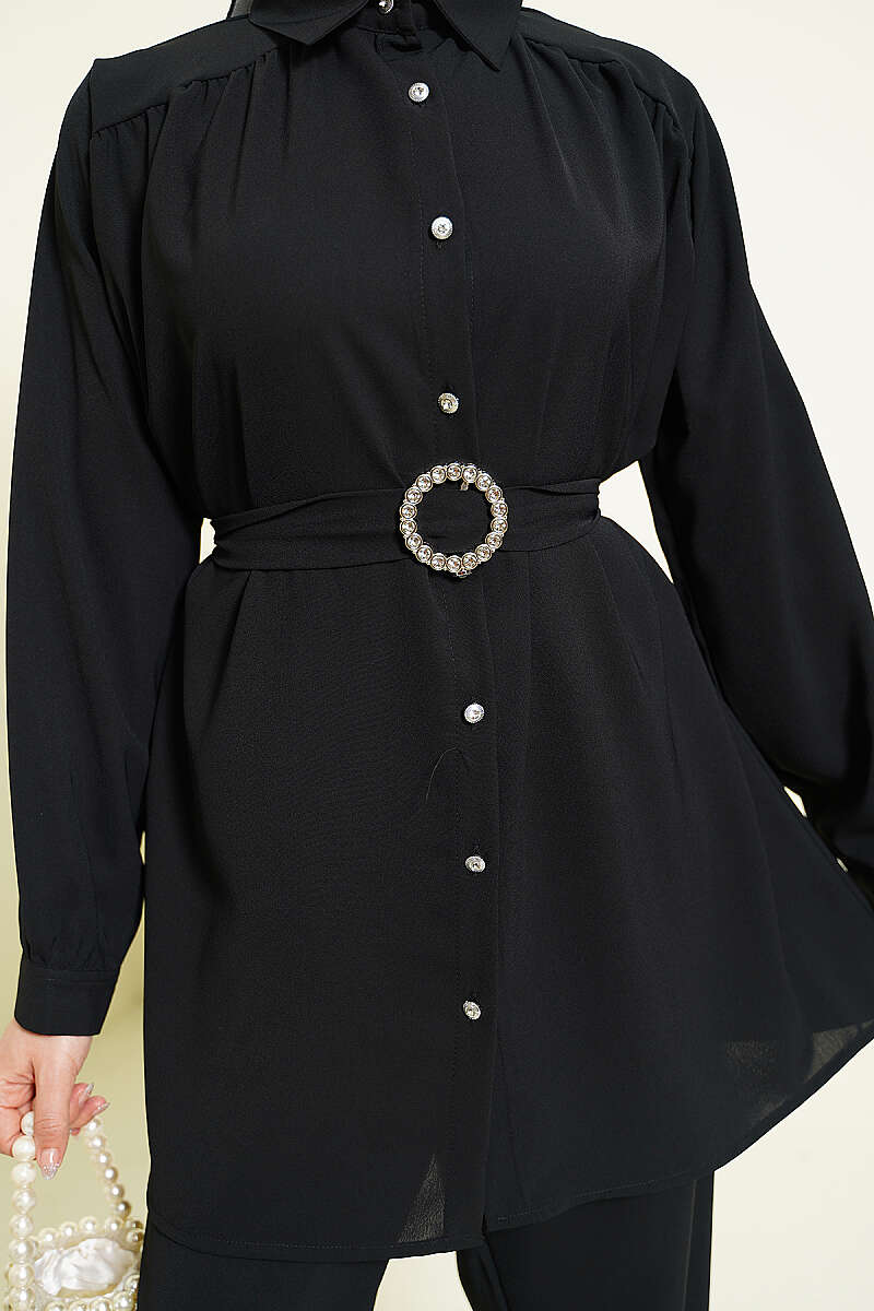 Taşlı Kemer Tokalı Kuşaklı İkili Takım Siyah