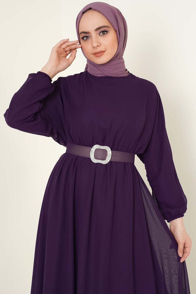Taşlı Kemer Tokalı Şifon Elbise Mor