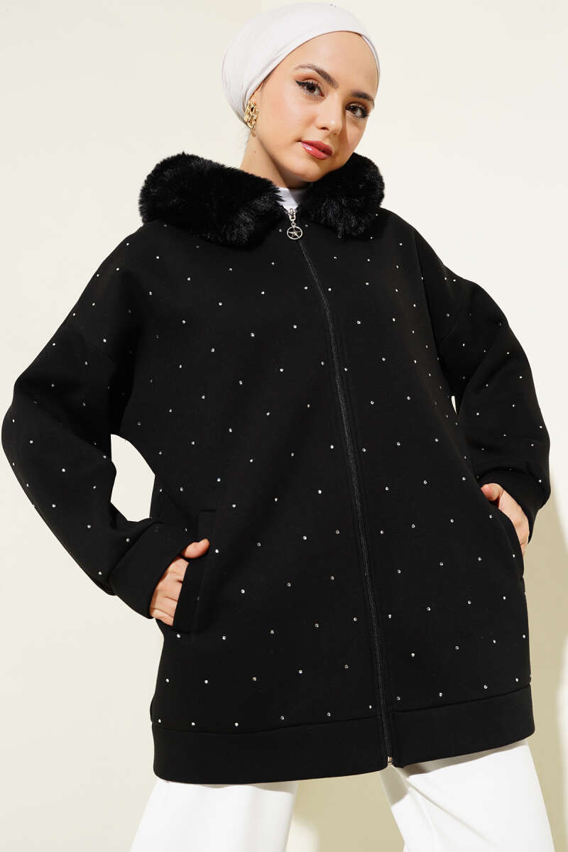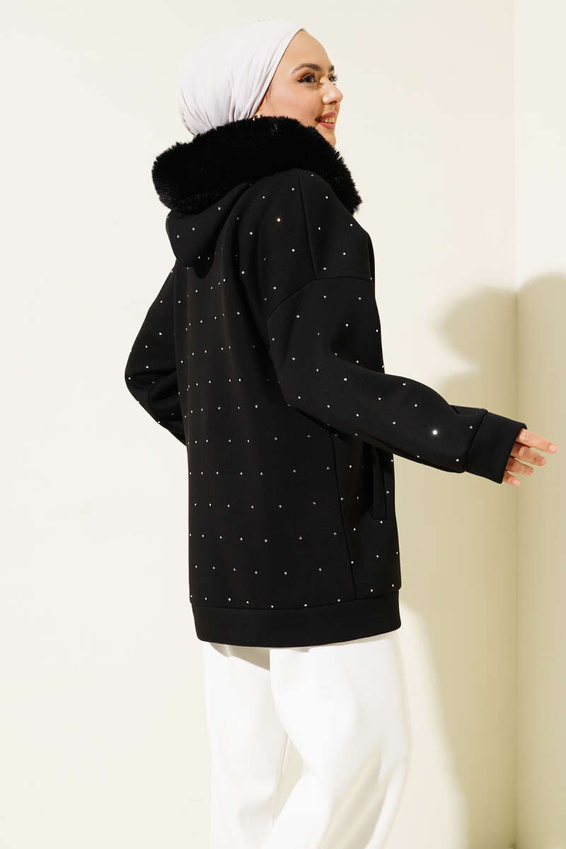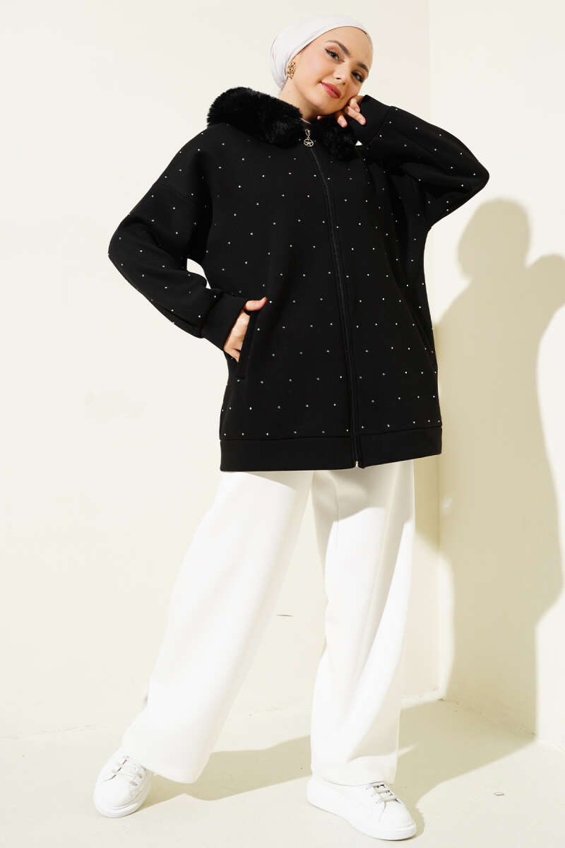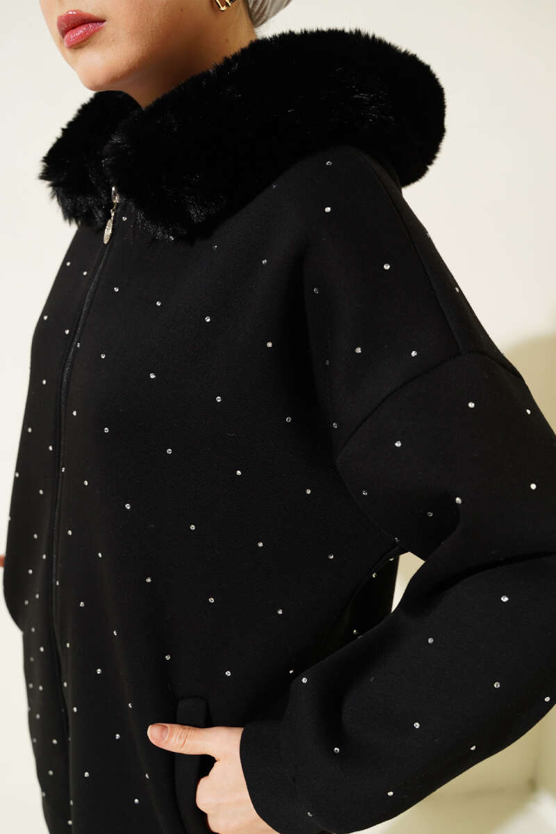 Taşlı Kürklü Üç İplik Hırka Siyah