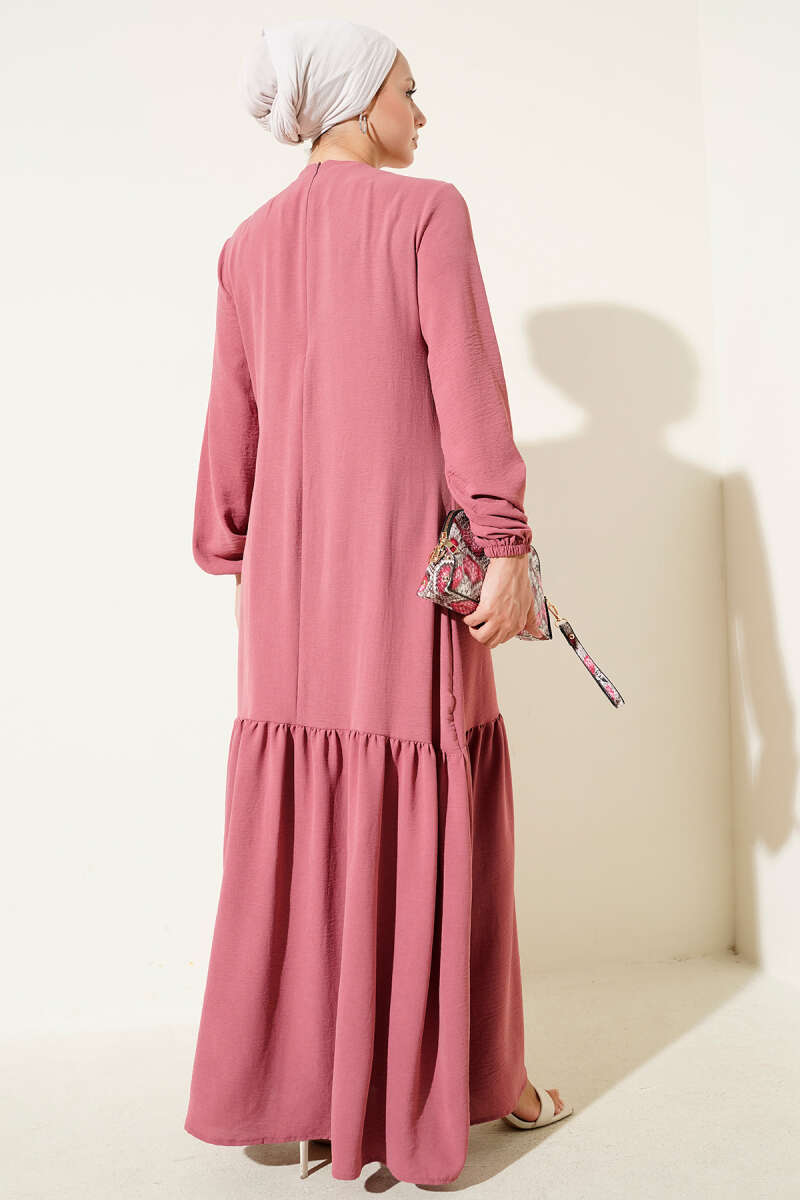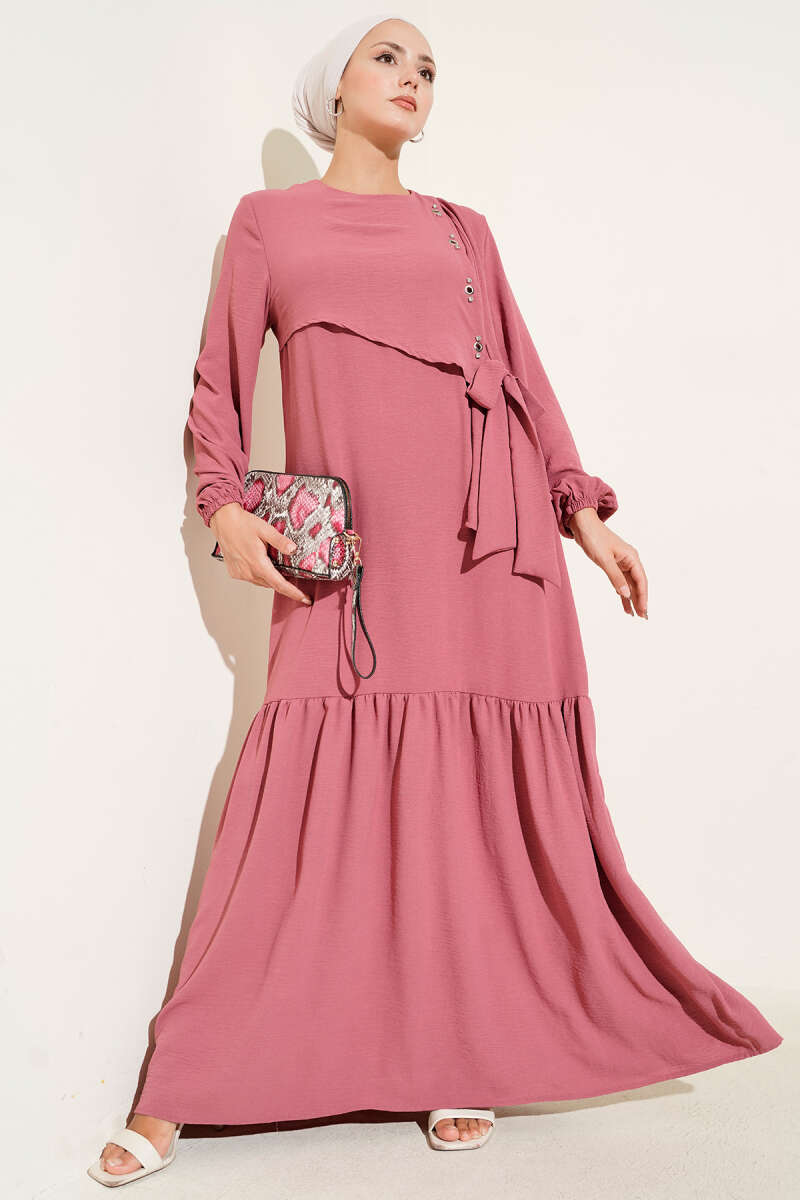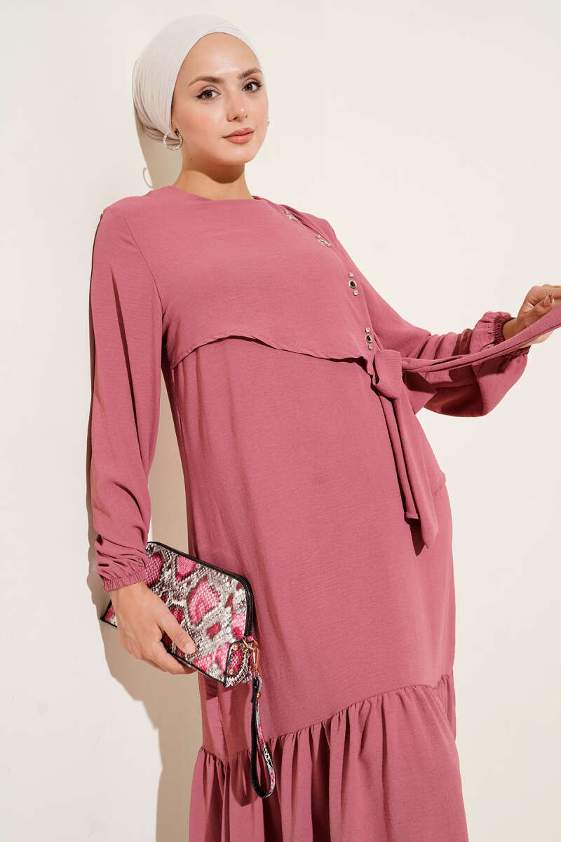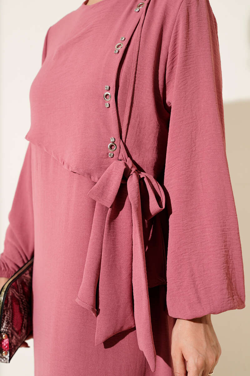 Taşlı Kuş Gözü Detaylı Bağlamalı Elbise Mürdüm