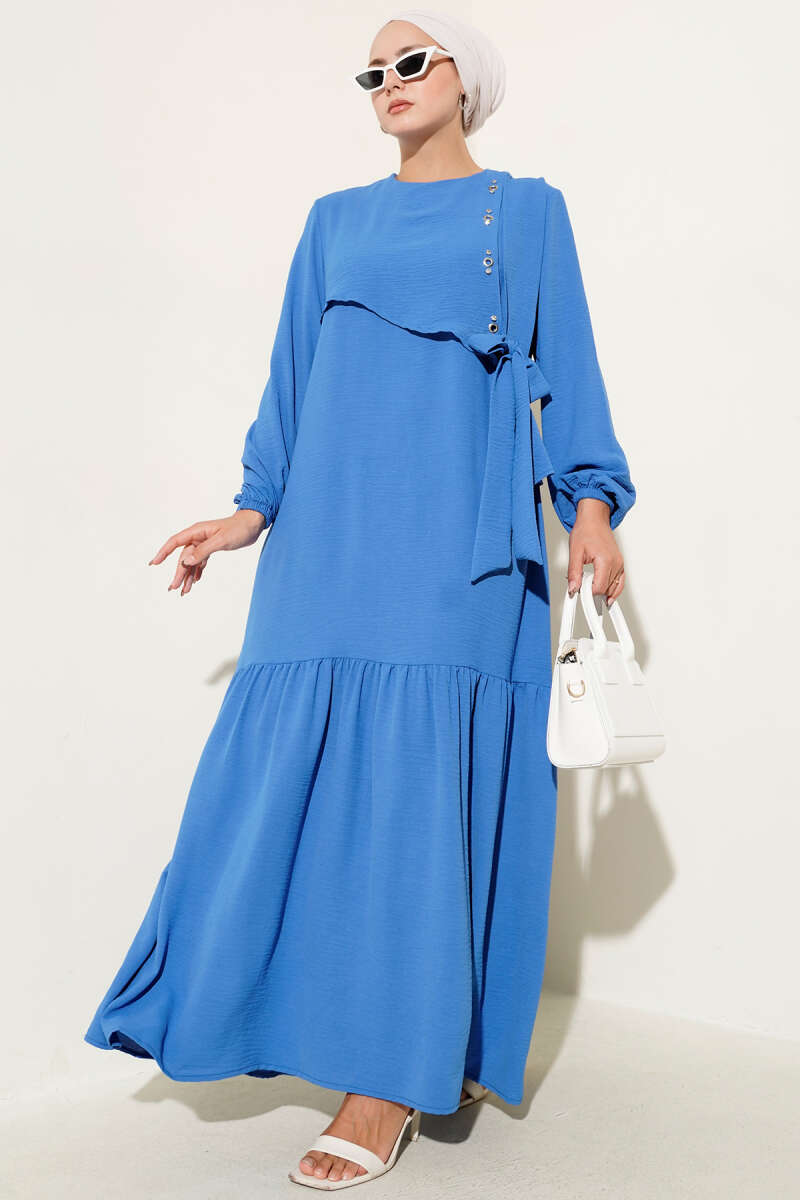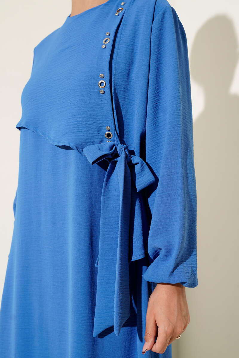 Taşlı Kuş Gözü Detaylı Bağlamalı Elbise Gri