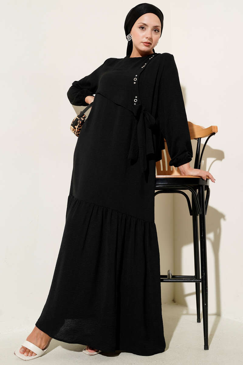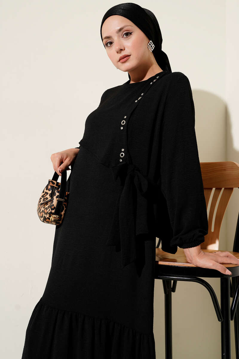 Taşlı Kuş Gözü Detaylı Bağlamalı Elbise Haki