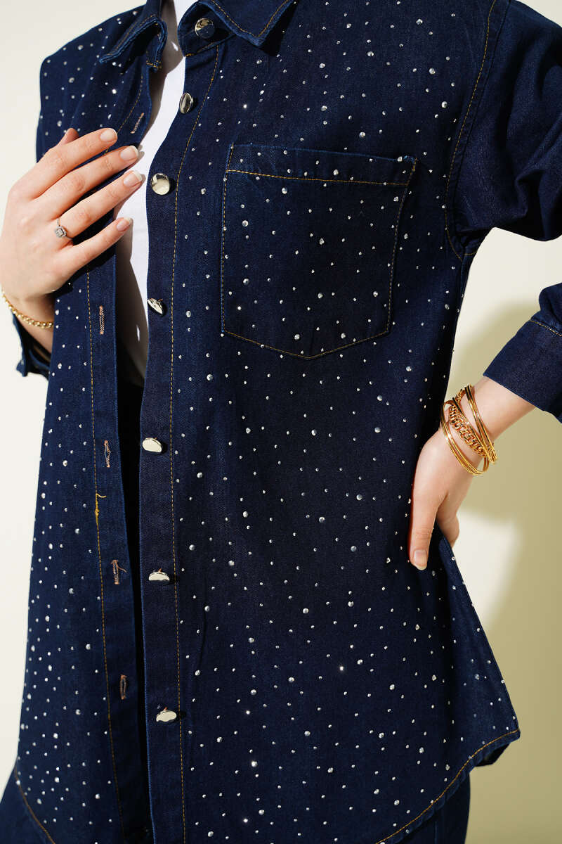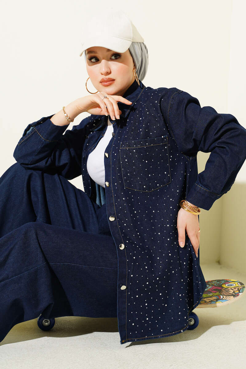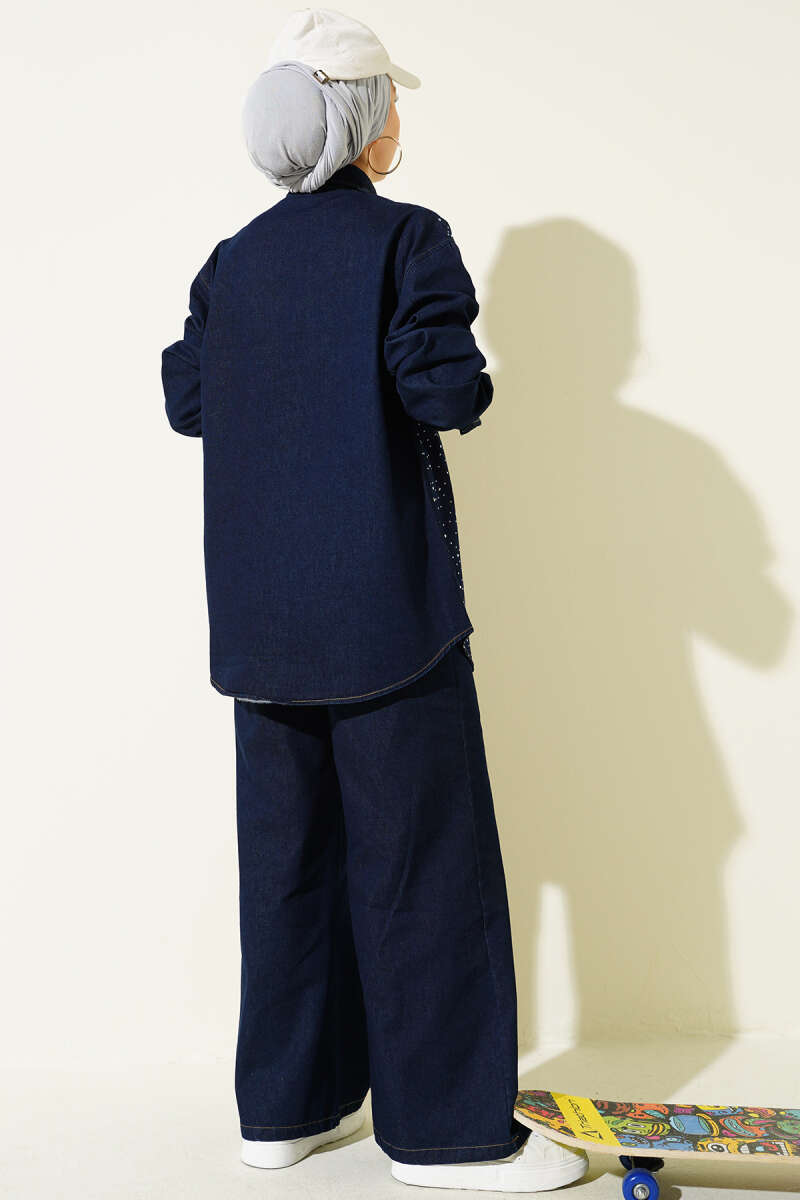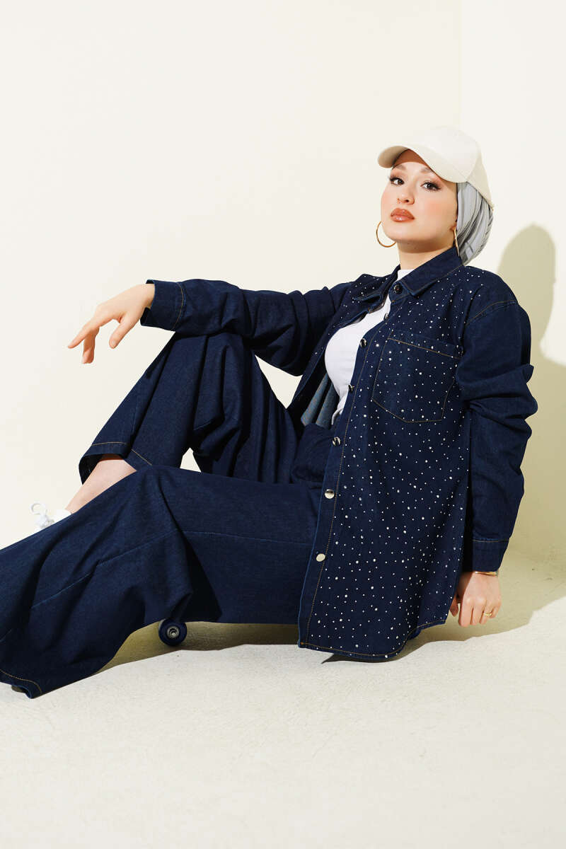 Taşlı Metal Düğmeli Kot İkili Takım Lacivert