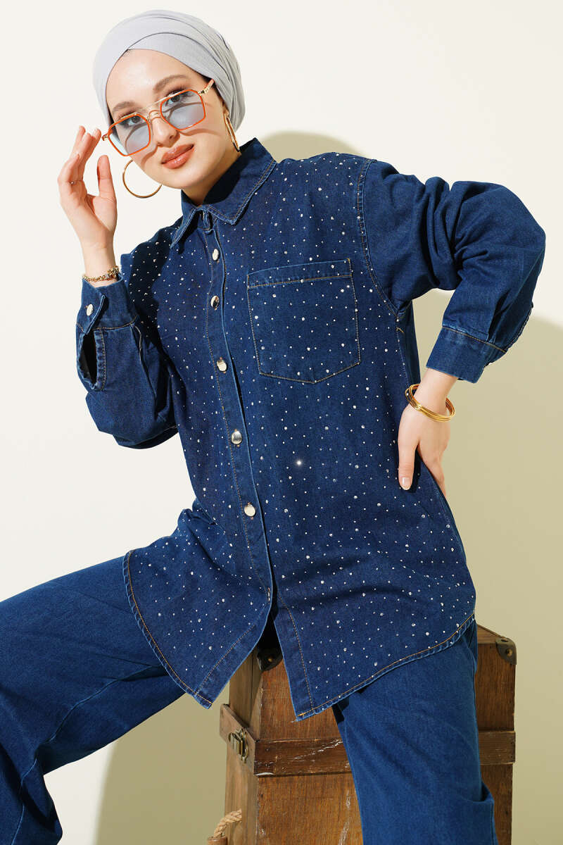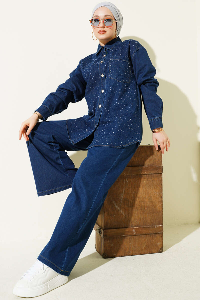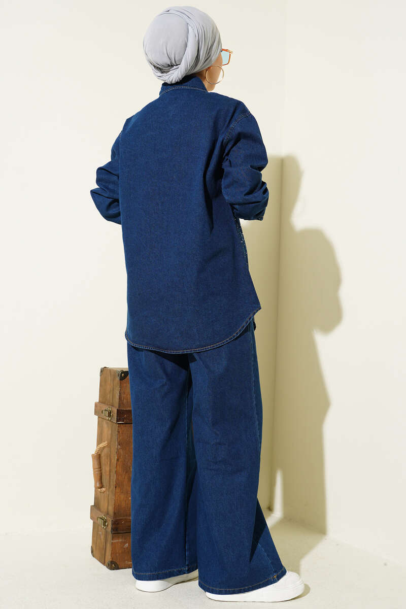Taşlı Metal Düğmeli Kot İkili Takım Mavi