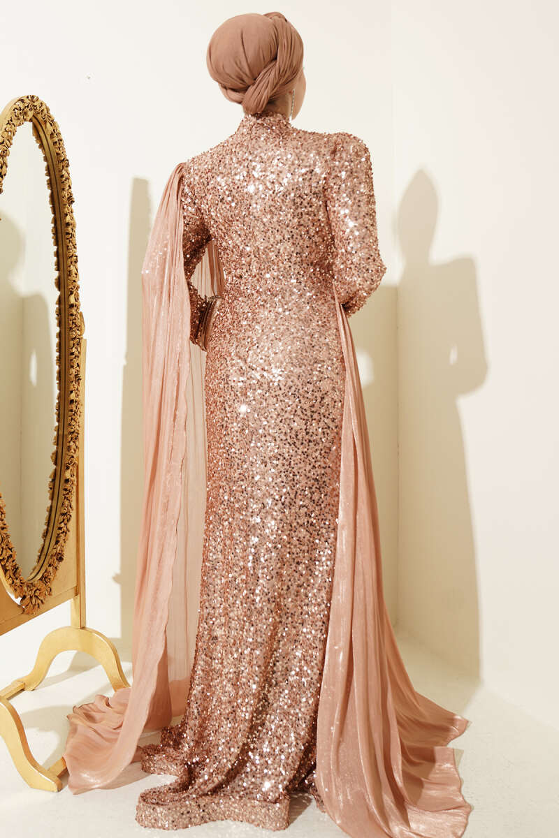 Taşlı Pul Payetli Pelerinli Abiye Elbise Bakır