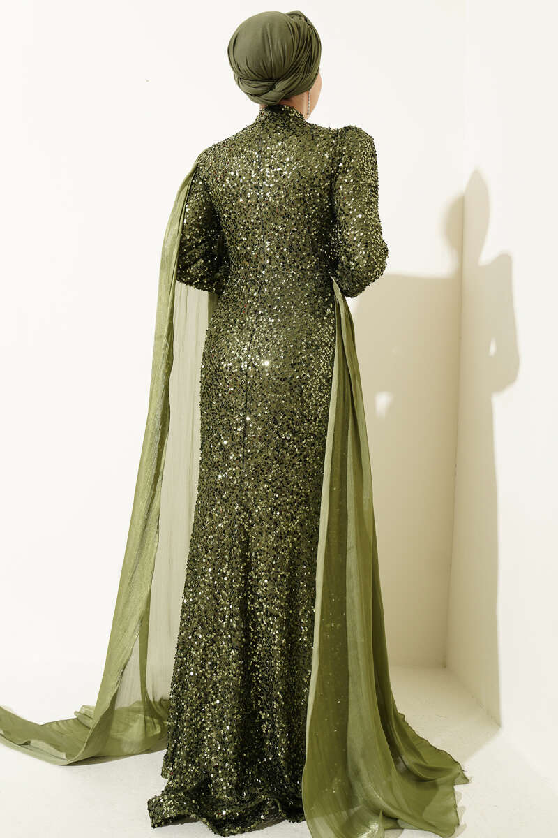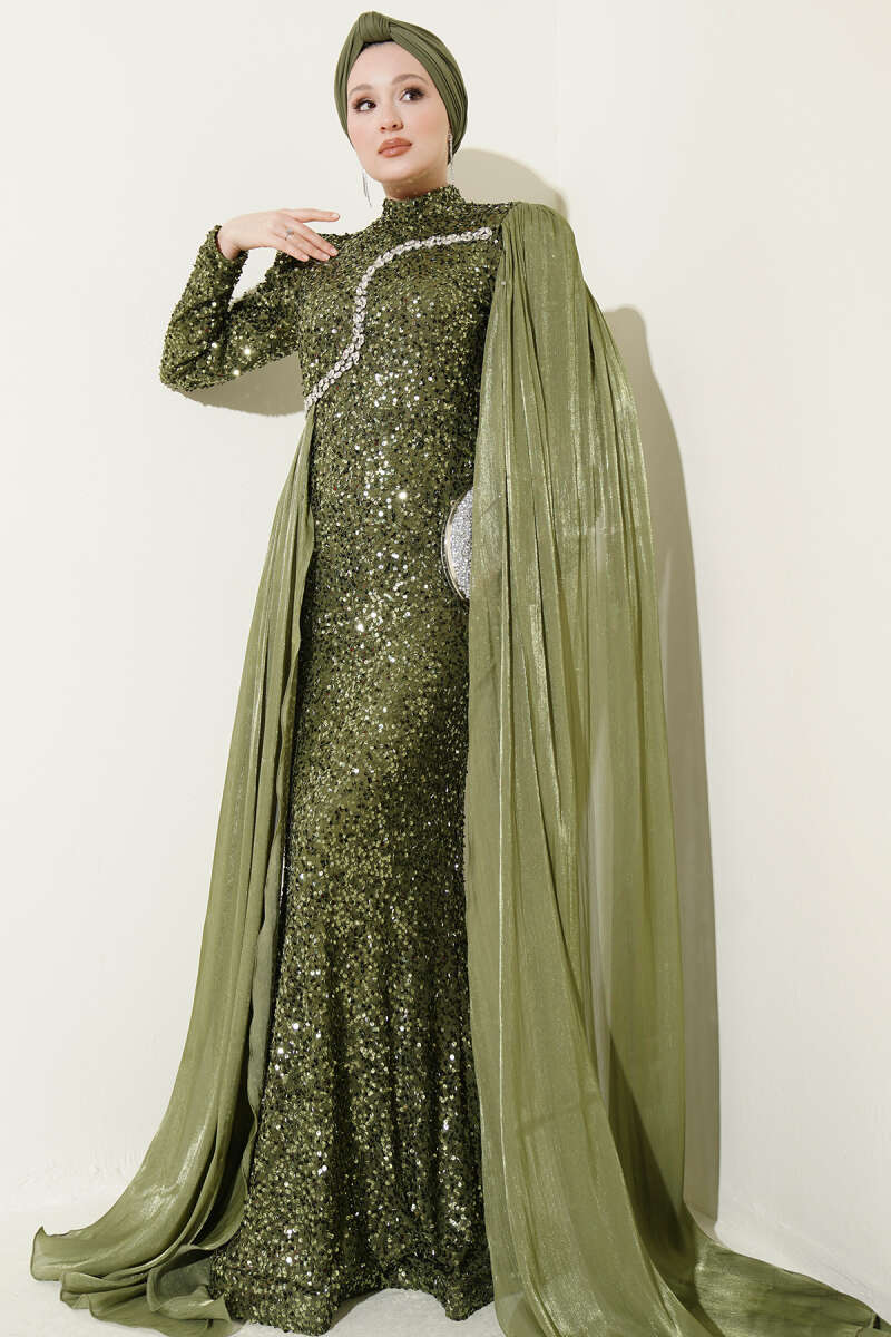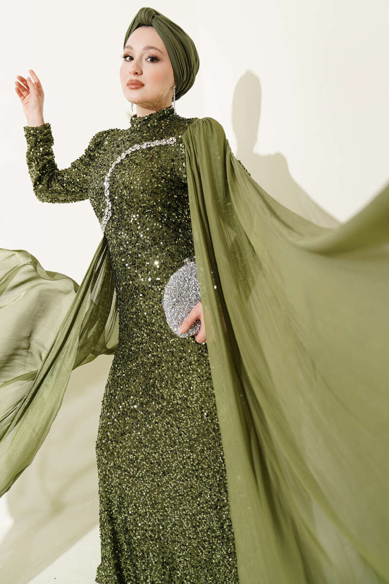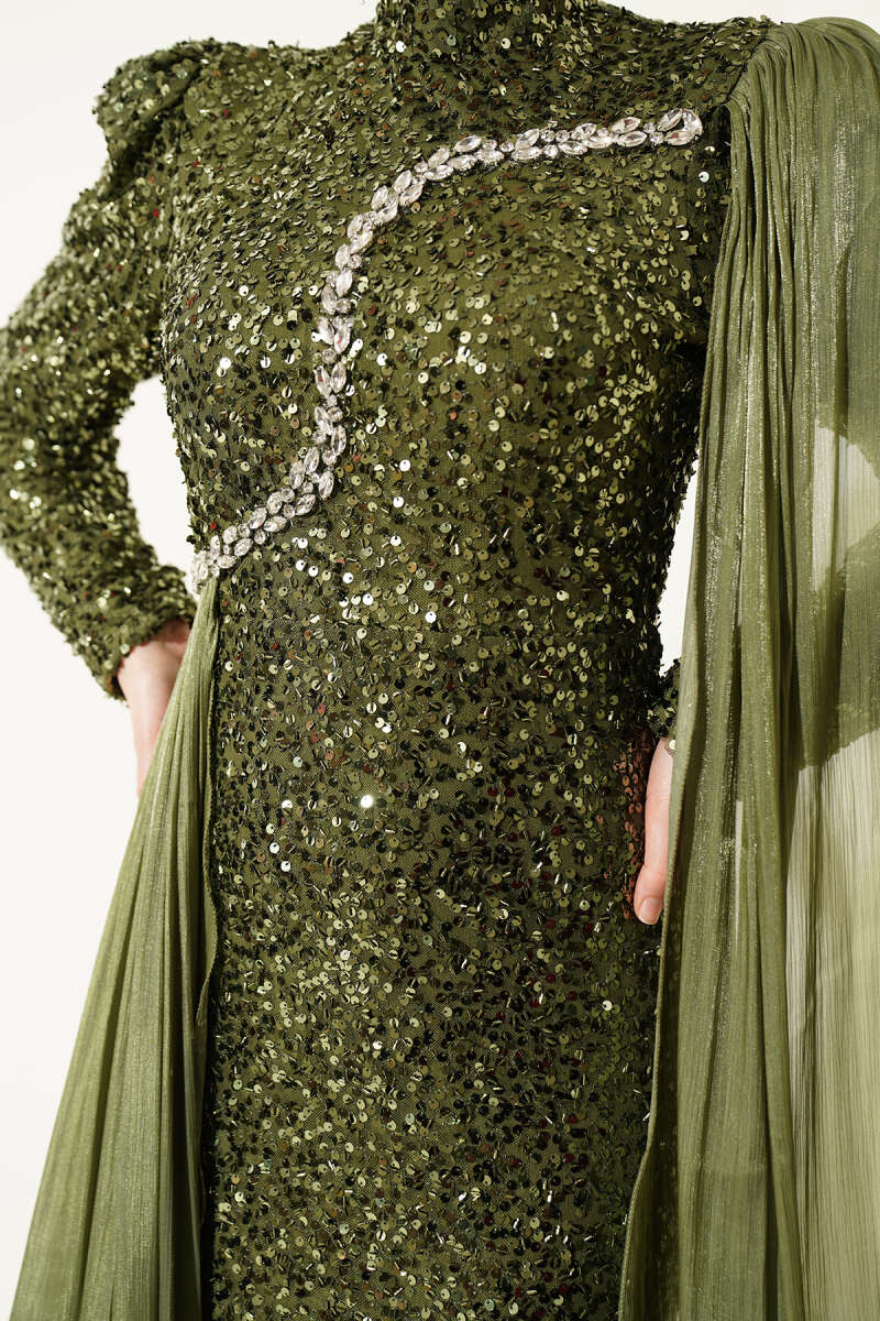 Taşlı Pul Payetli Pelerinli Abiye Elbise Haki