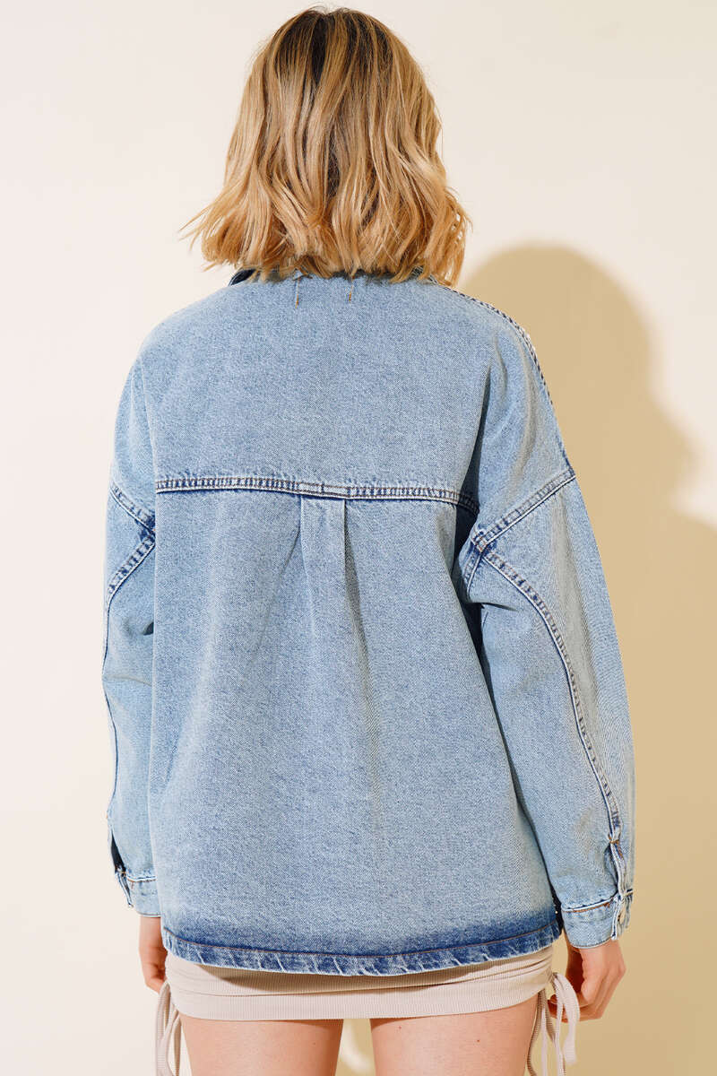 Yeni sezon kot ceket modelimiz sizlerle beraber. Önü taşlı ceketimizin iki adet torba cebi bulunmaktadır. Arkası tek piledir. Oversize modeldir. Kol bilekleri düğmelidir.