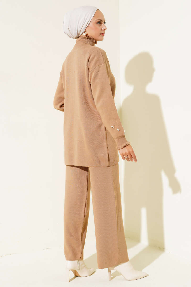 Dikiş Detaylı Basic Triko İkili Takım Bej