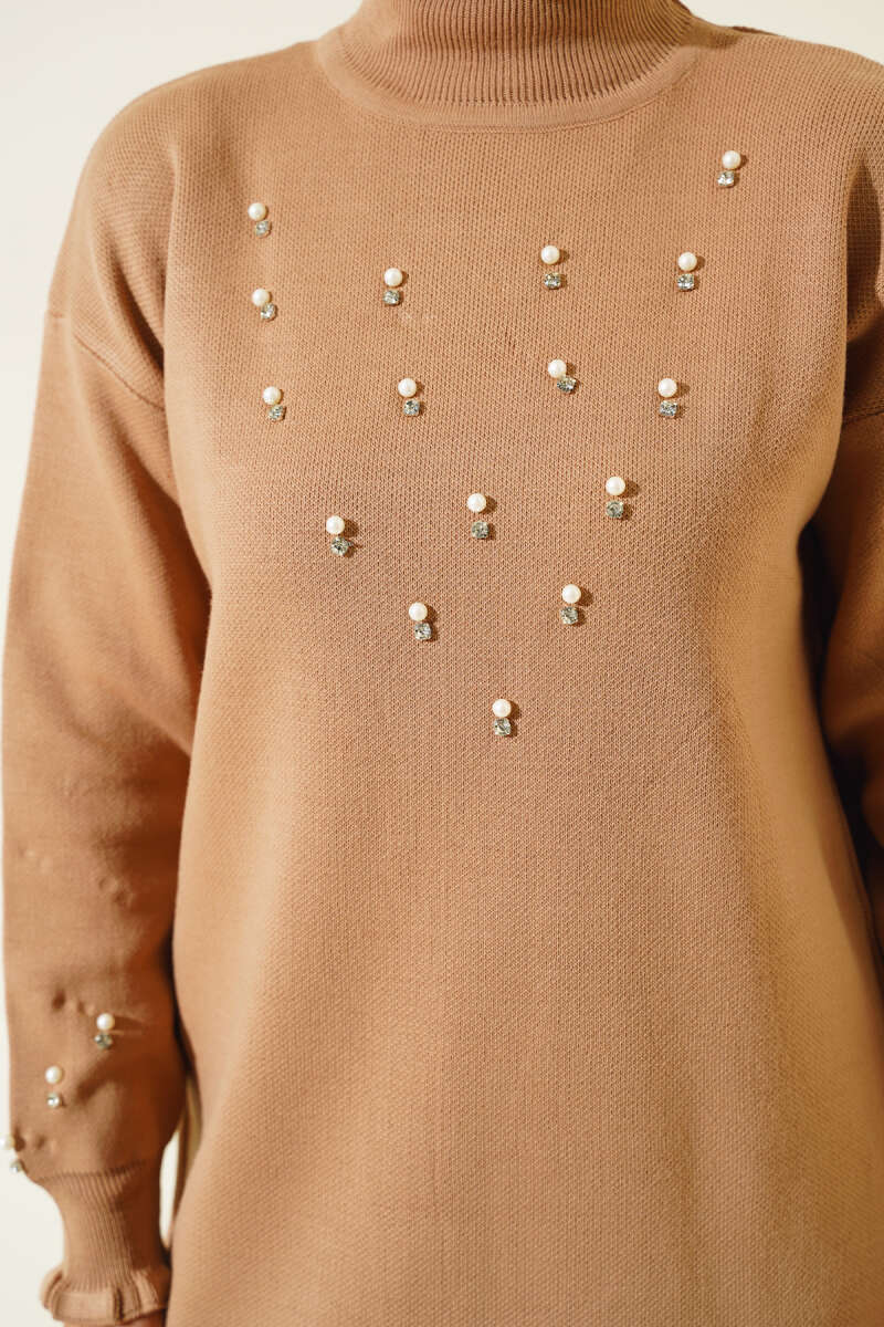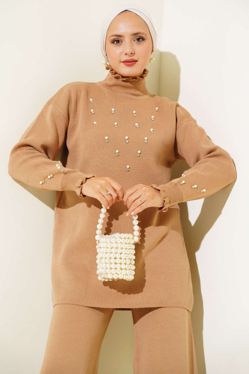 Balon Kol Balıkçı Yaka Triko İkili Takım Kahve