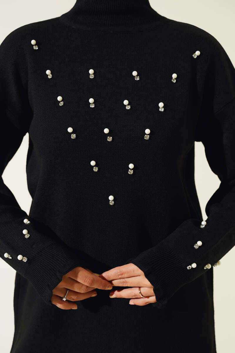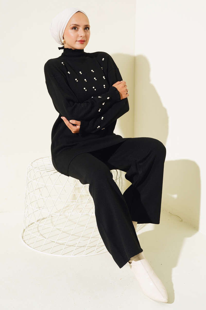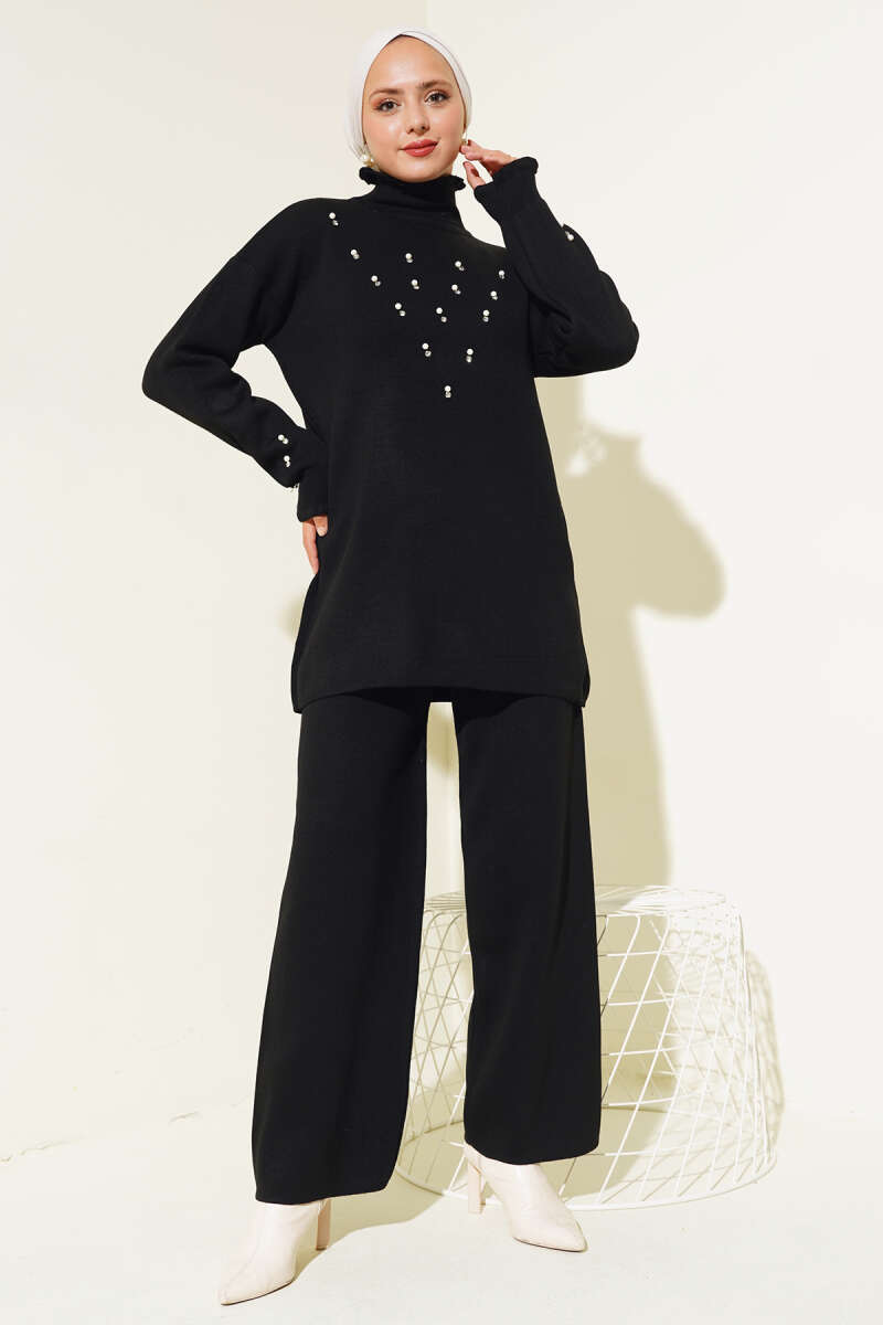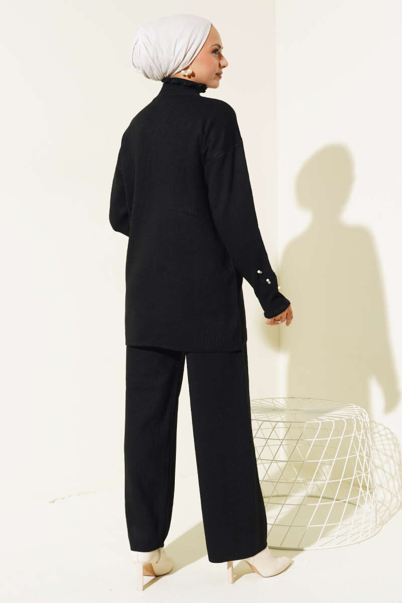 Balon Kol Balıkçı Yaka Triko İkili Takım Siyah