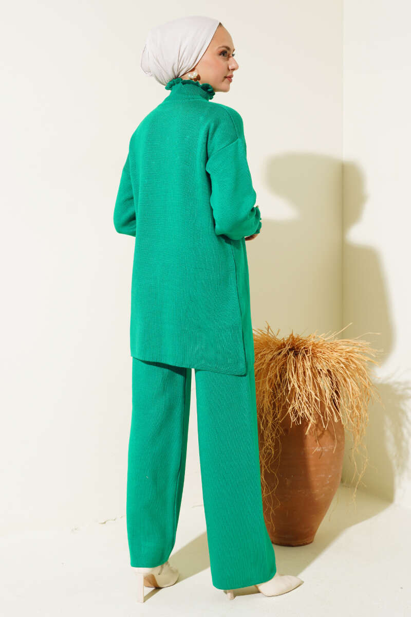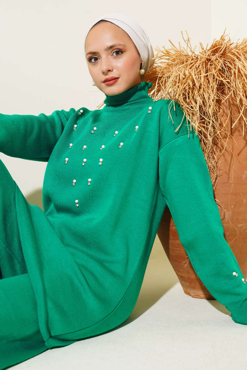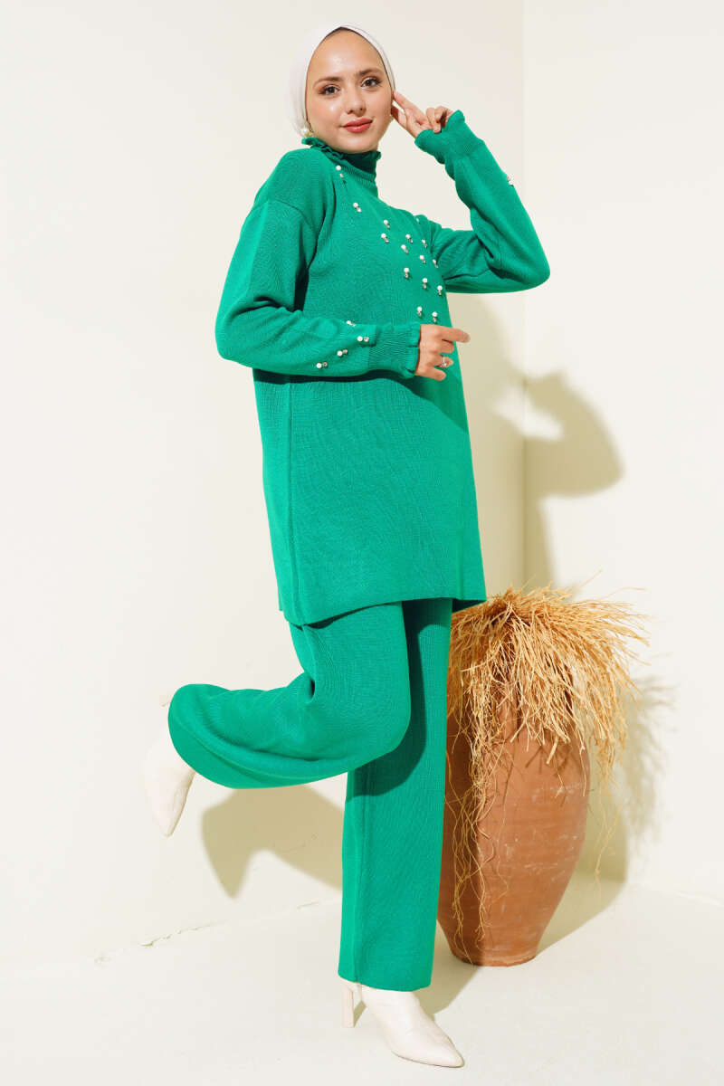 Taşlı Baklava Desen Triko İkili Takım Zümrüt