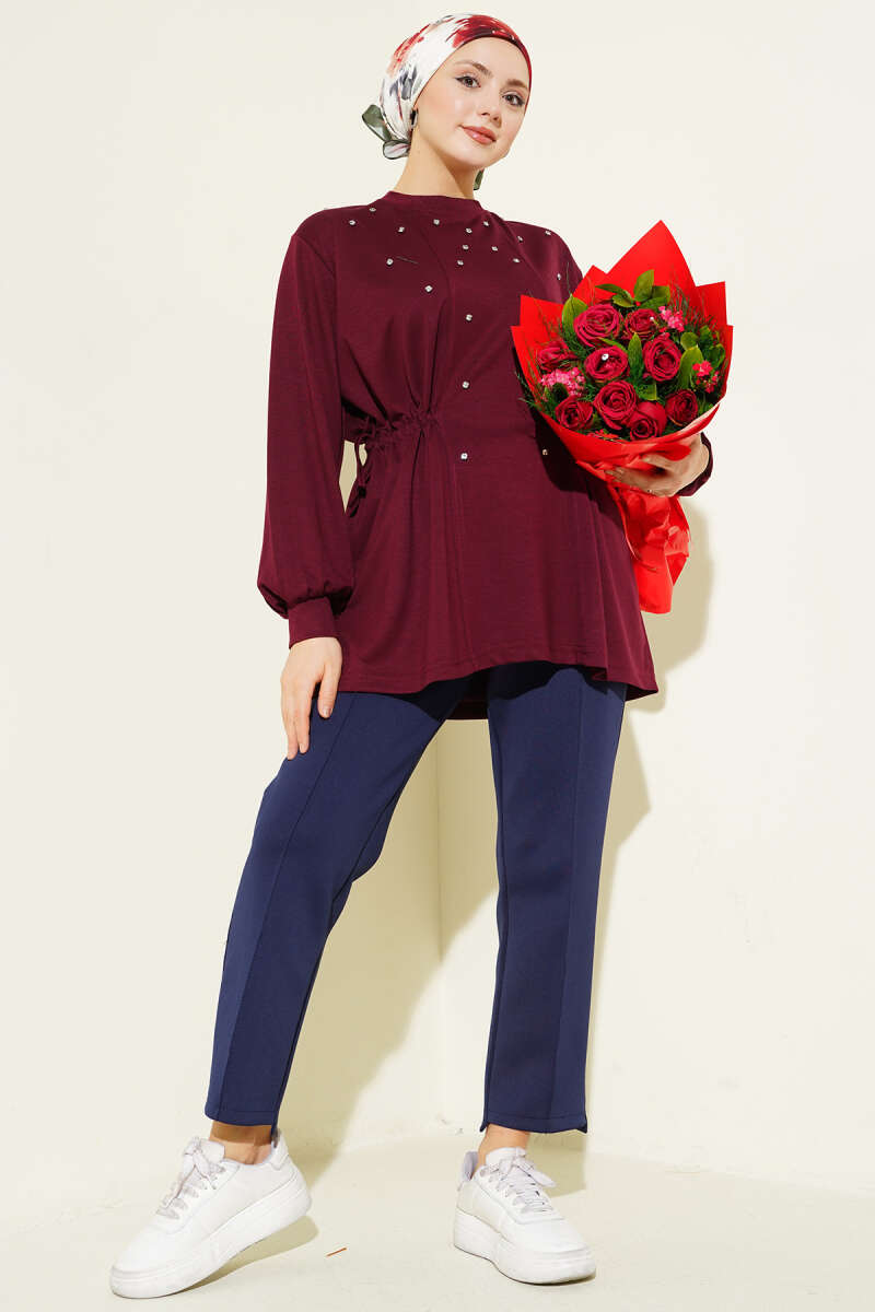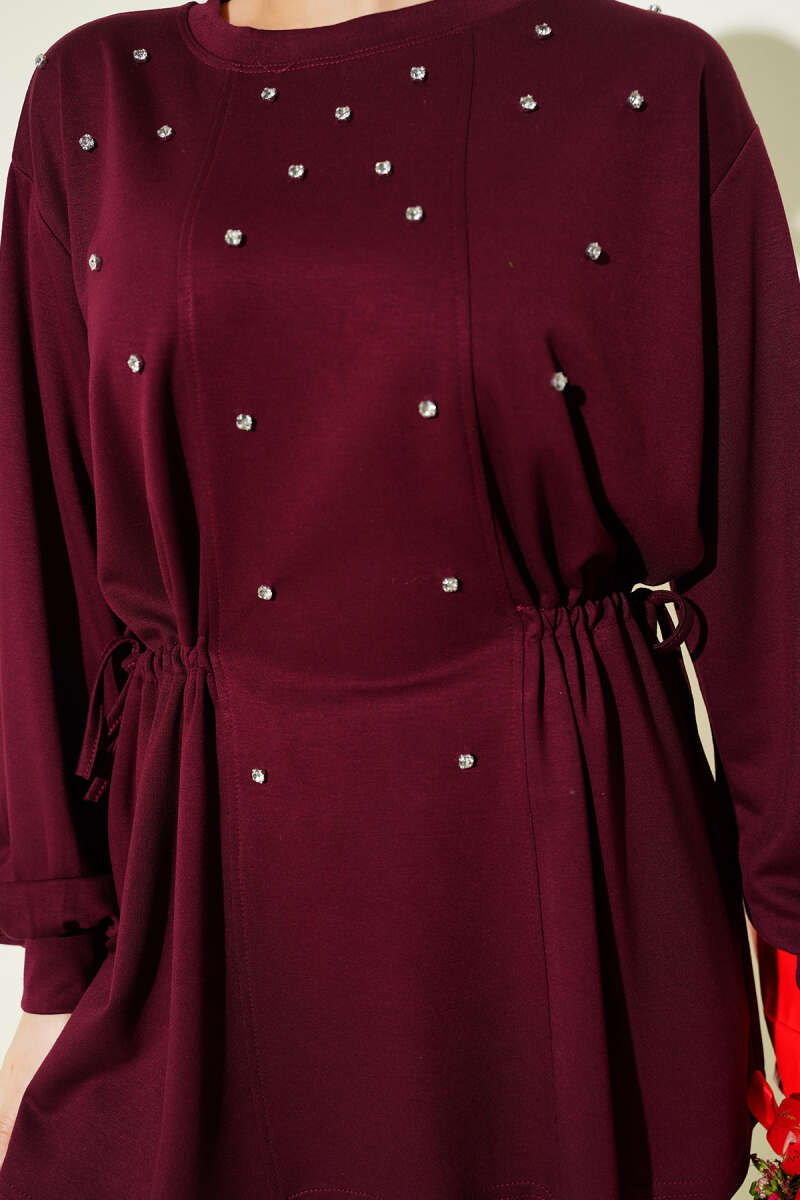 Dik Şerit Taşlı Loyşa Tunik Bordo