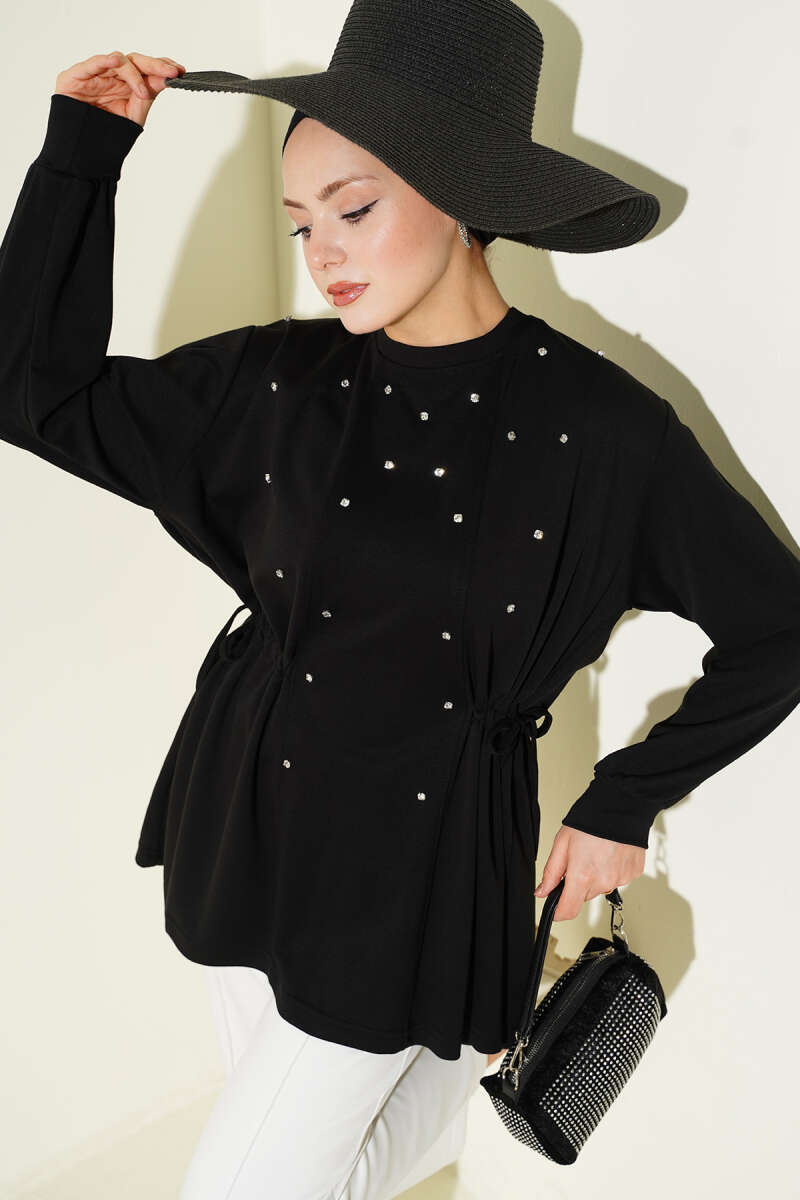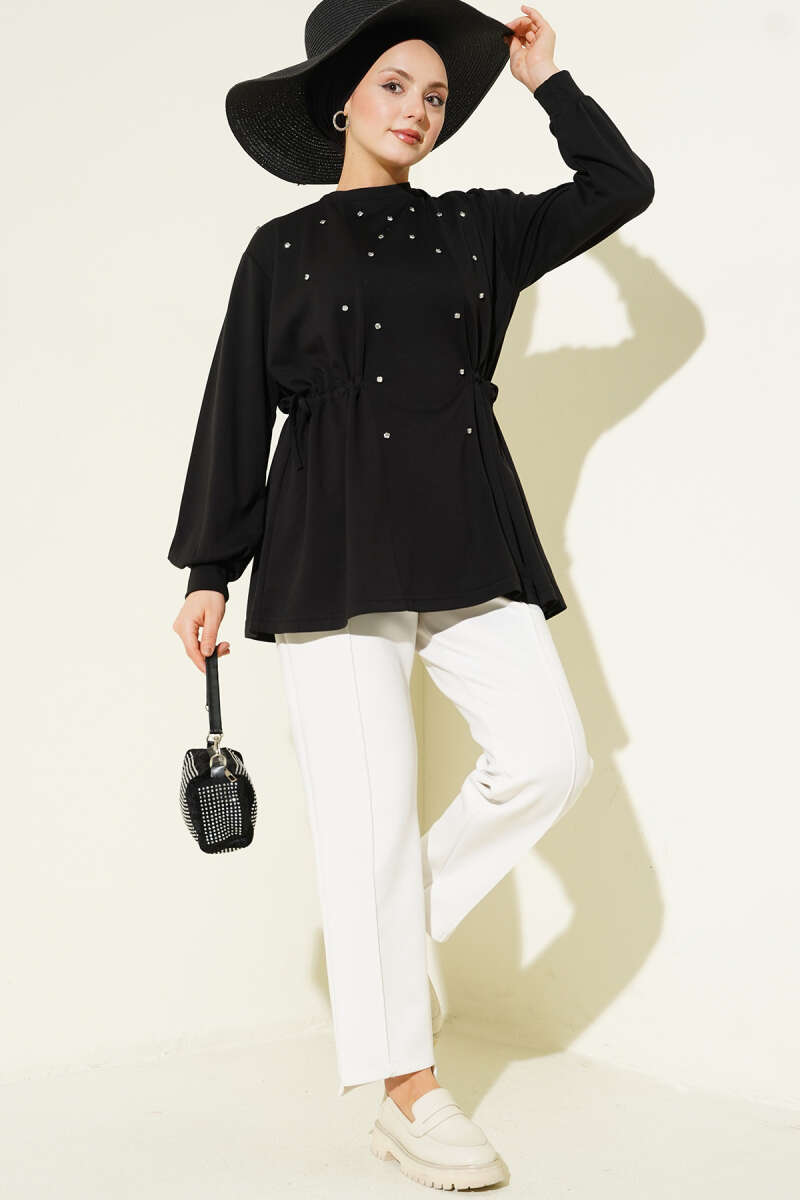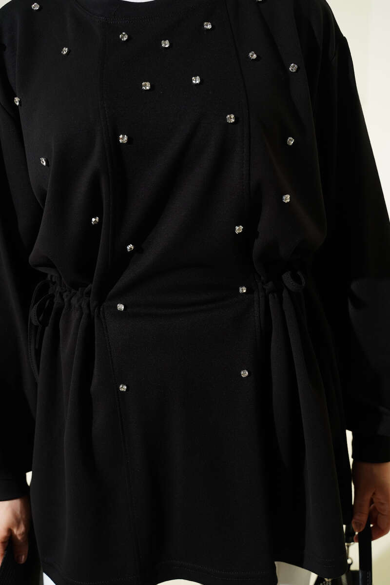 Dik Şerit Taşlı Loyşa Tunik Siyah