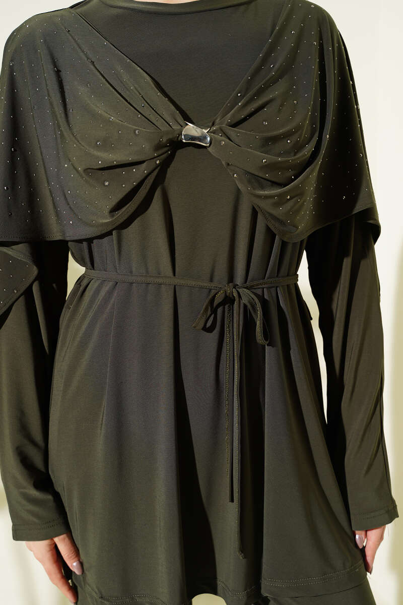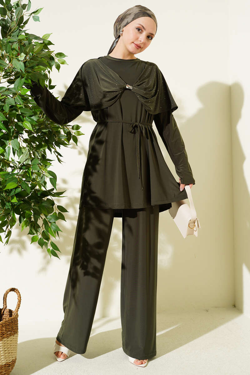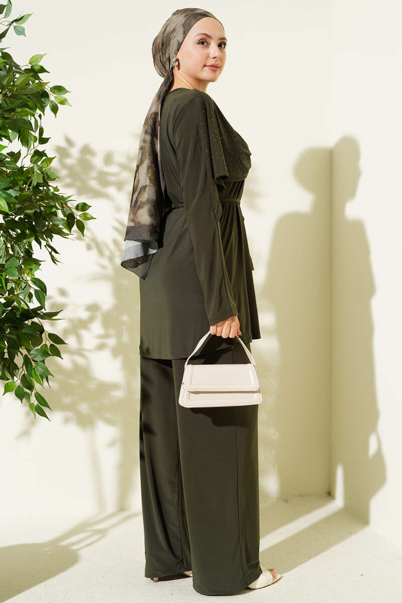 Taşlı Yan Yırtmaçlı İkili Takım Haki