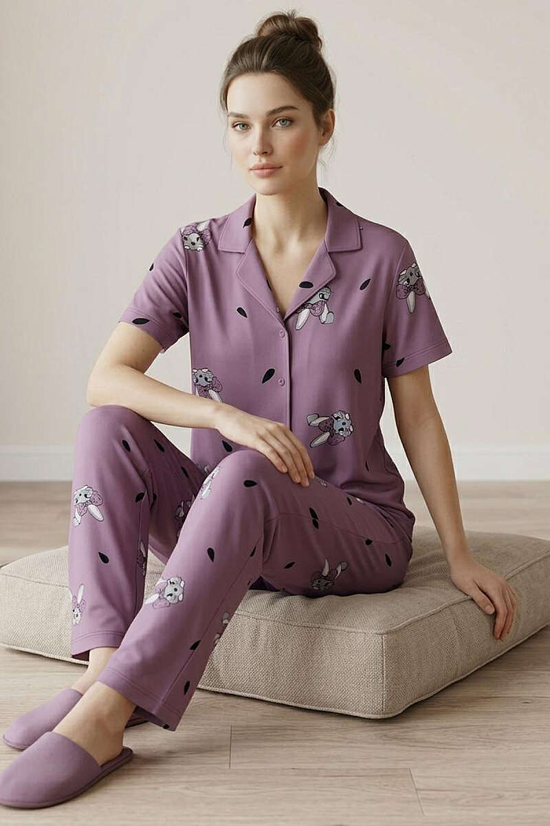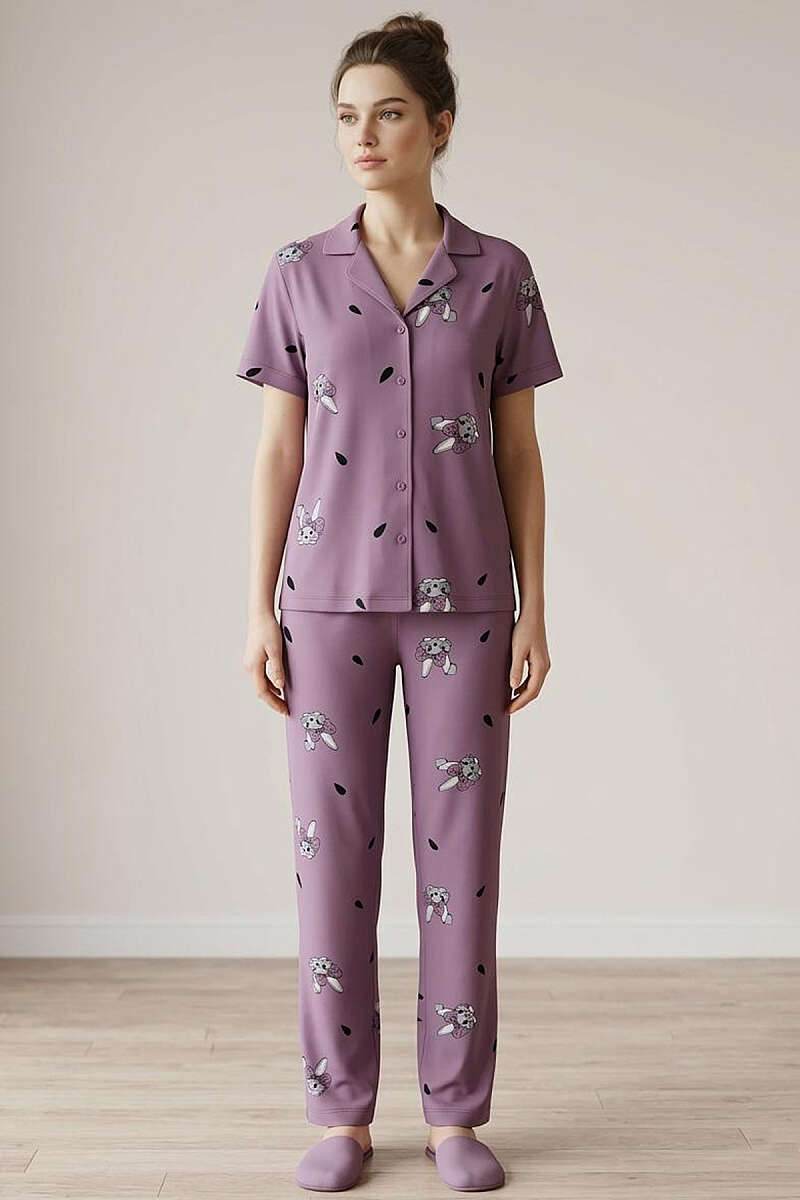 Tavşan Baskılı Gömlek Yaka Kısa Kol Pijama Takımı Lila