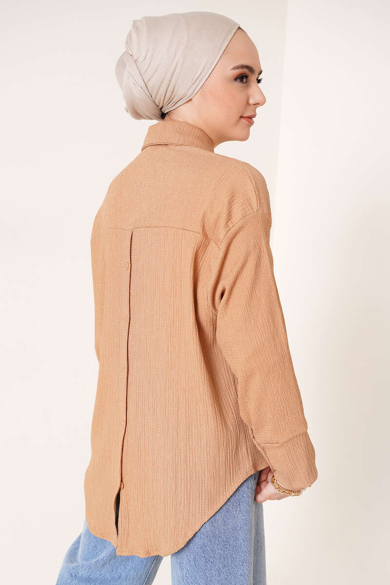 Yeni sezon bürümcük gömlek arkası önünüden uzundur. Göğsünde tek cebi bulunan gömleğimizin düşük omuz salaş modeldir. Sırtında bulunan düğme detayı gömleğe hareket katmıştır. Sırtındaki düğmeler kullanılabilmektedir. Kol manşetleri çift düğmelidir.