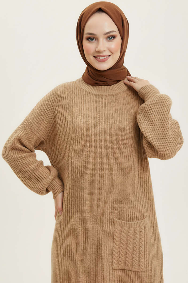 Kol ve Yaka Pliseli Taşlı Elbise Camel