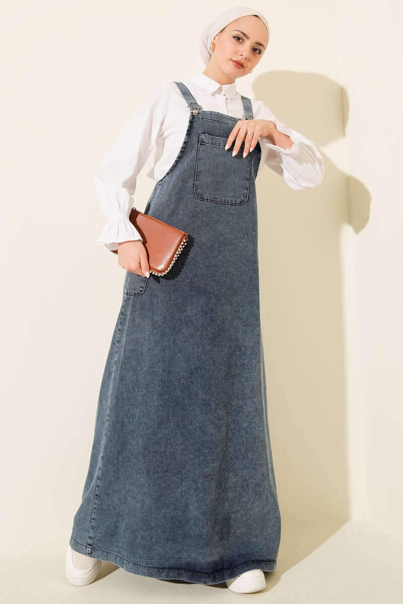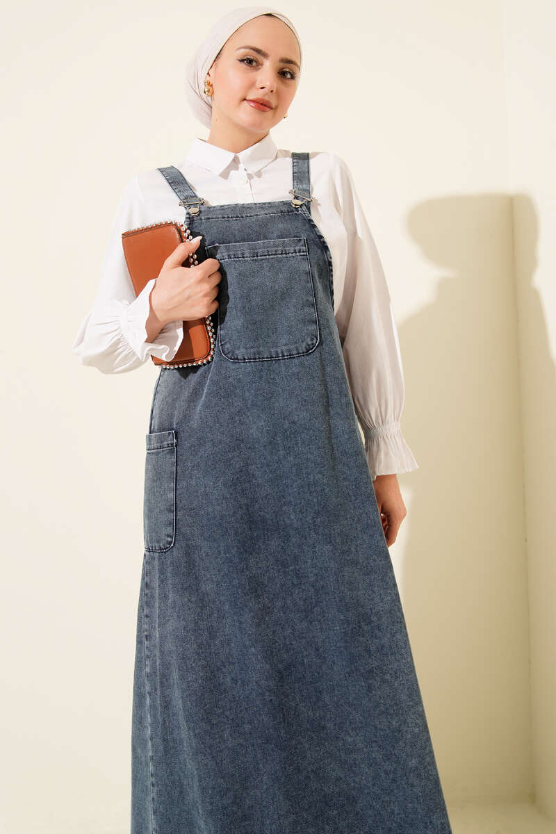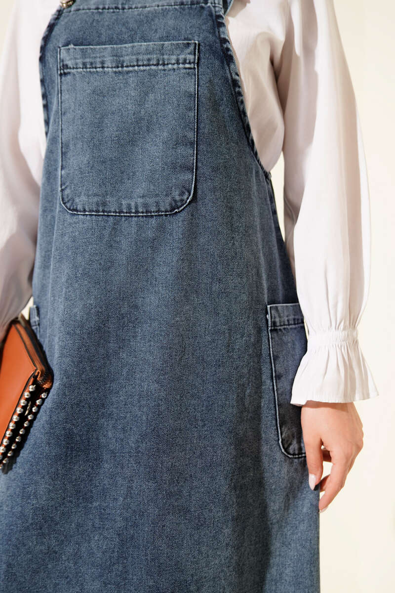 Tek Cepli Askılı Jile Kot Elbise Mavi
