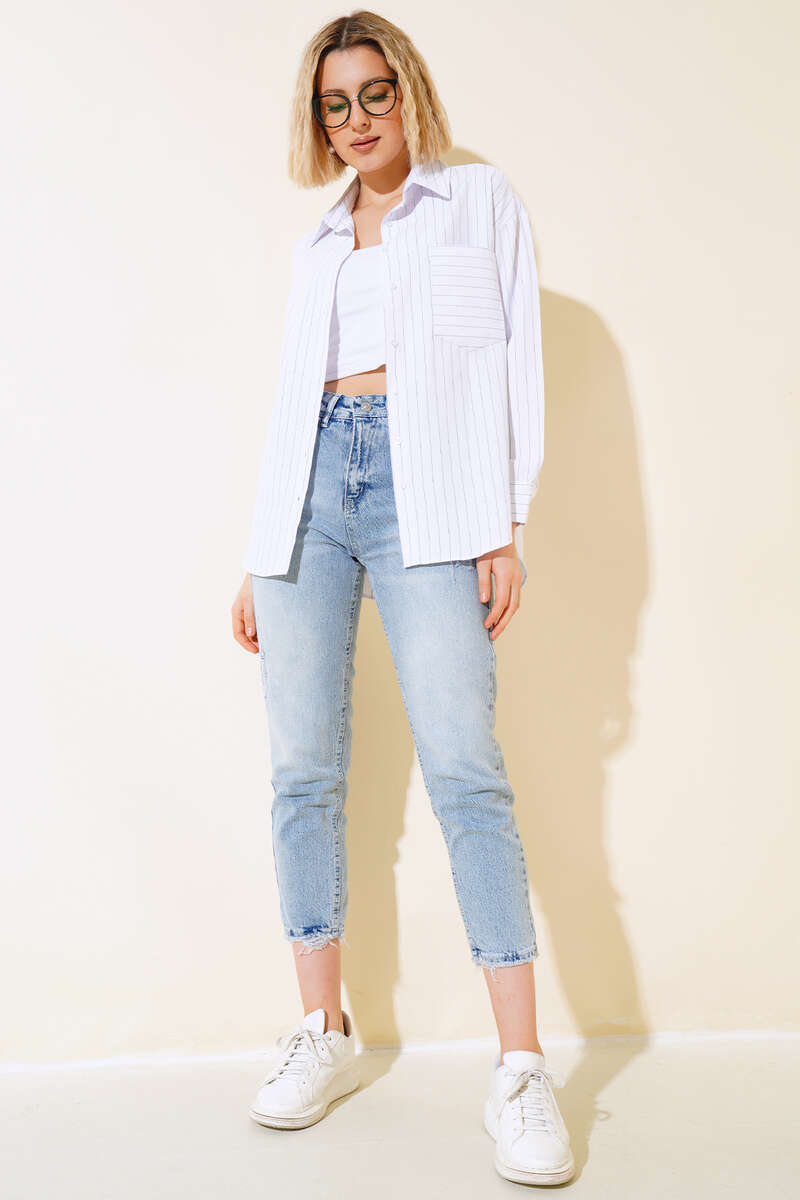 Tek Cepli Çizgili Gömlek Ekru