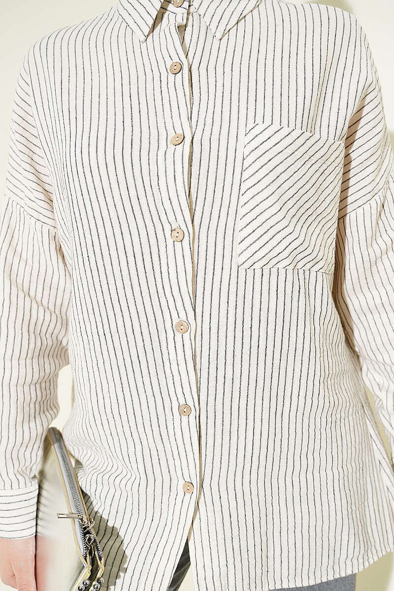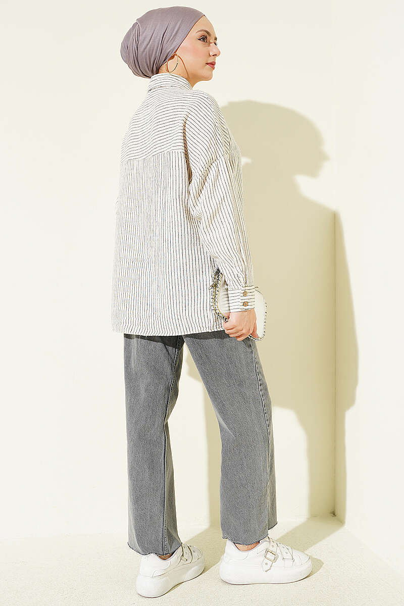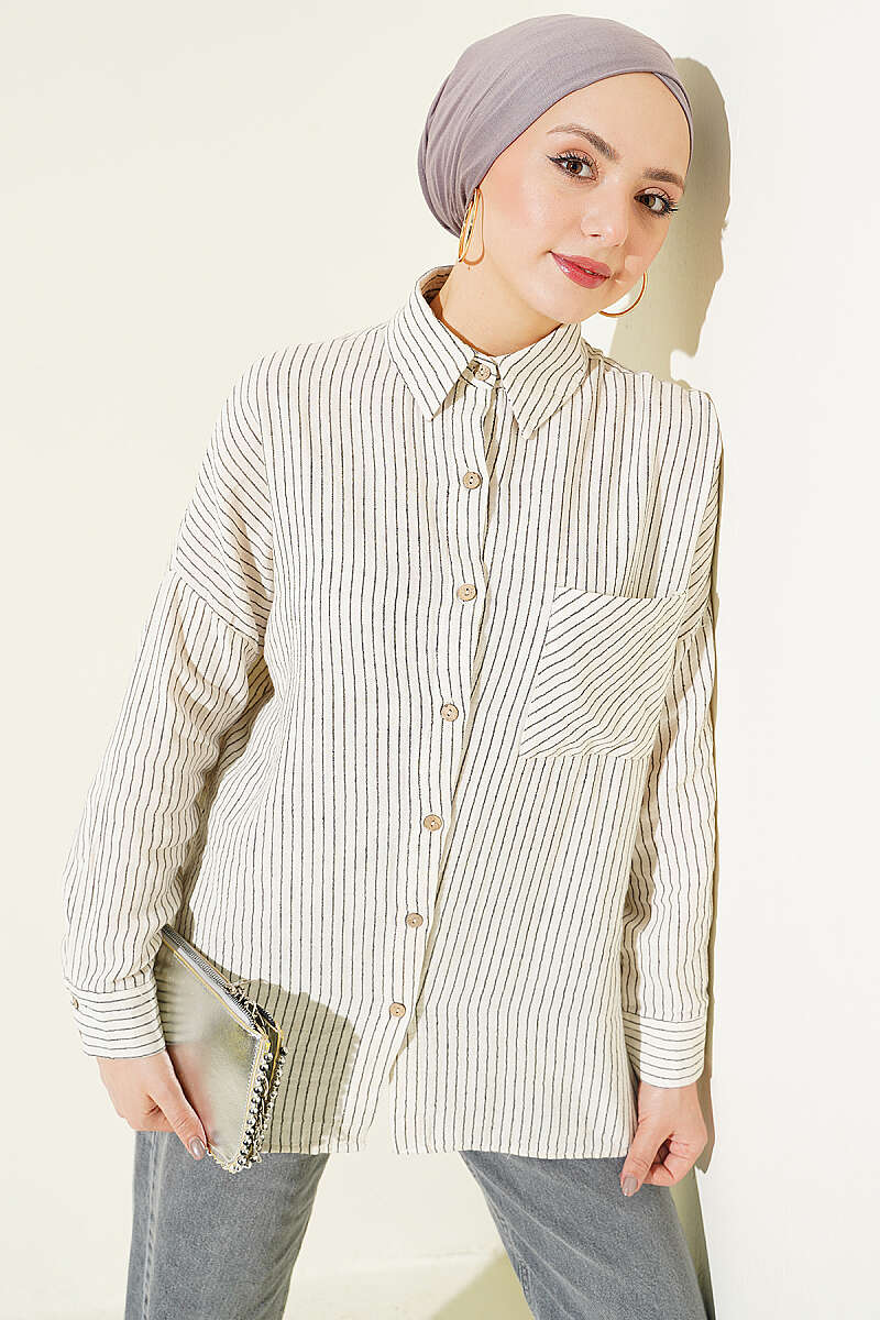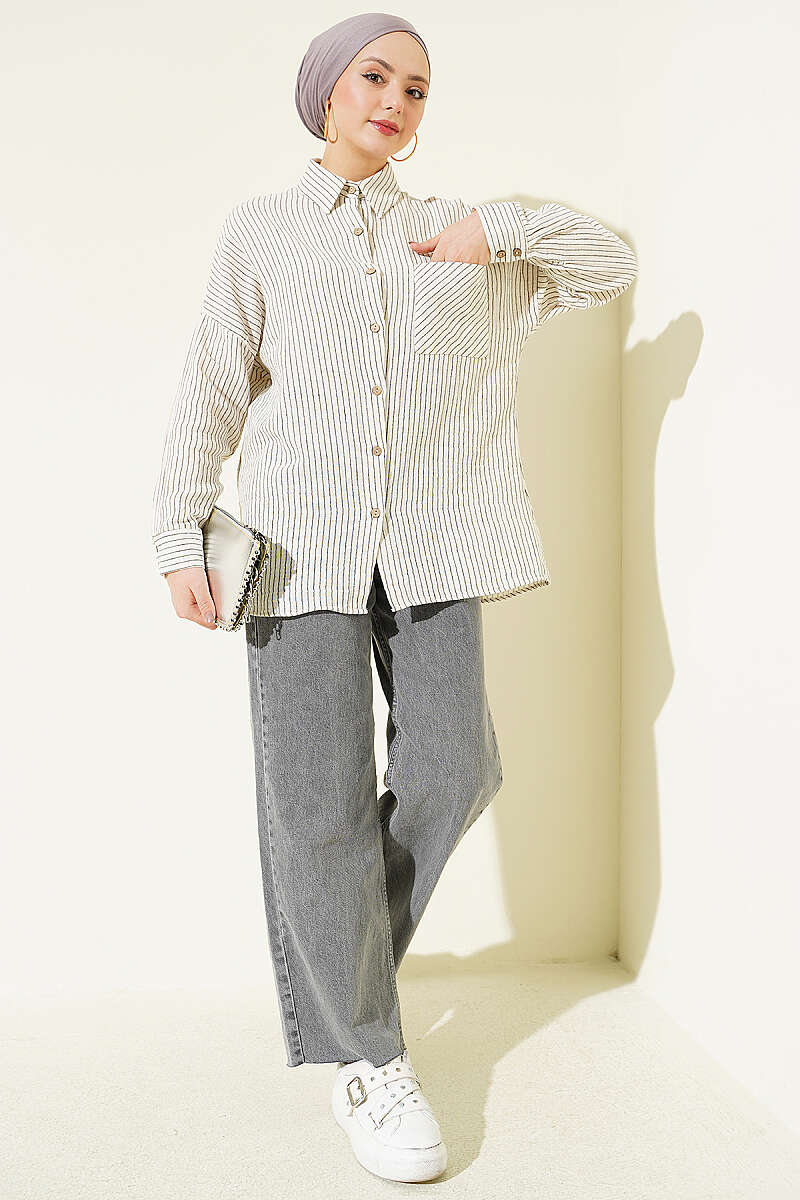 Bu gömlek, müslin kumaşın doğal ve nefes alan yapısıyla birleşen dikey çizgili deseni sayesinde hem konforlu hem de stil sahibi bir görünüm sunar. Tasarımındaki tek cep detayı, klasik gömlek formuna modern ve sportif bir dokunuş katarken günlük kullanım için işlevsellik sağlar. Düşük omuzlu ve rahat kesimi, gün boyu hareket özgürlüğü sunarak zahmetsiz bir şıklık elde etmenize yardımcı olur. Doğal dokusu ve zamansız çizgileriyle, pantolon veya eteklerle kombinlendiğinde her mevsime uygun, ferah bir stil oluşturur.